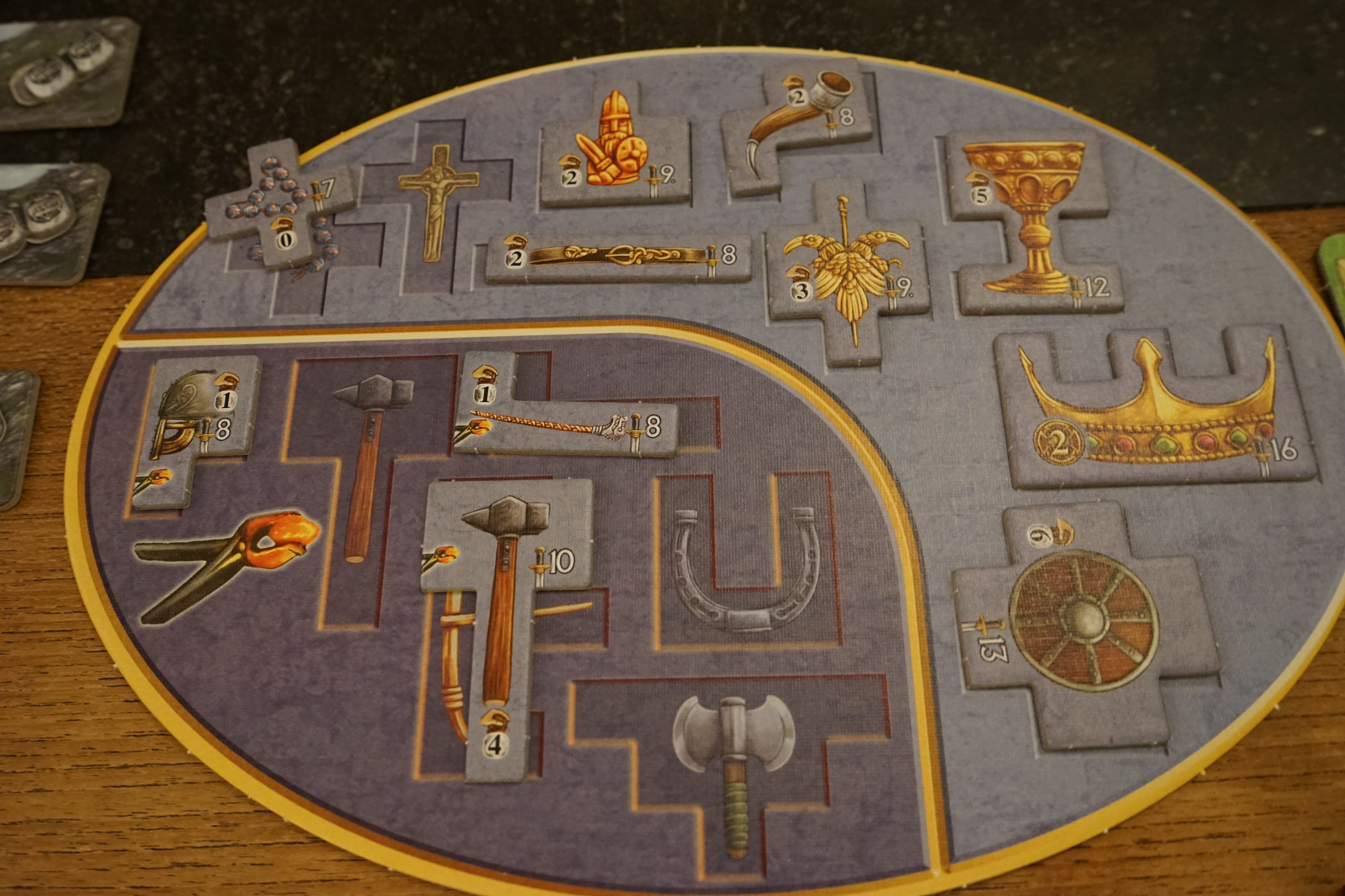 A la Gloire d’Odin est un Uwe de pure souche. On y retrouve donc des mécaniques qu’il a déjà exploitées dans d’autres jeux. Les actions ressemblent à celles d’Agricola (échanges de ressources en d’autres plus développées, nourrir ses ouvriers, etc.), Cottage Garden et Indian Summer (tuiles à placer sur son plateau, à la Tetris).