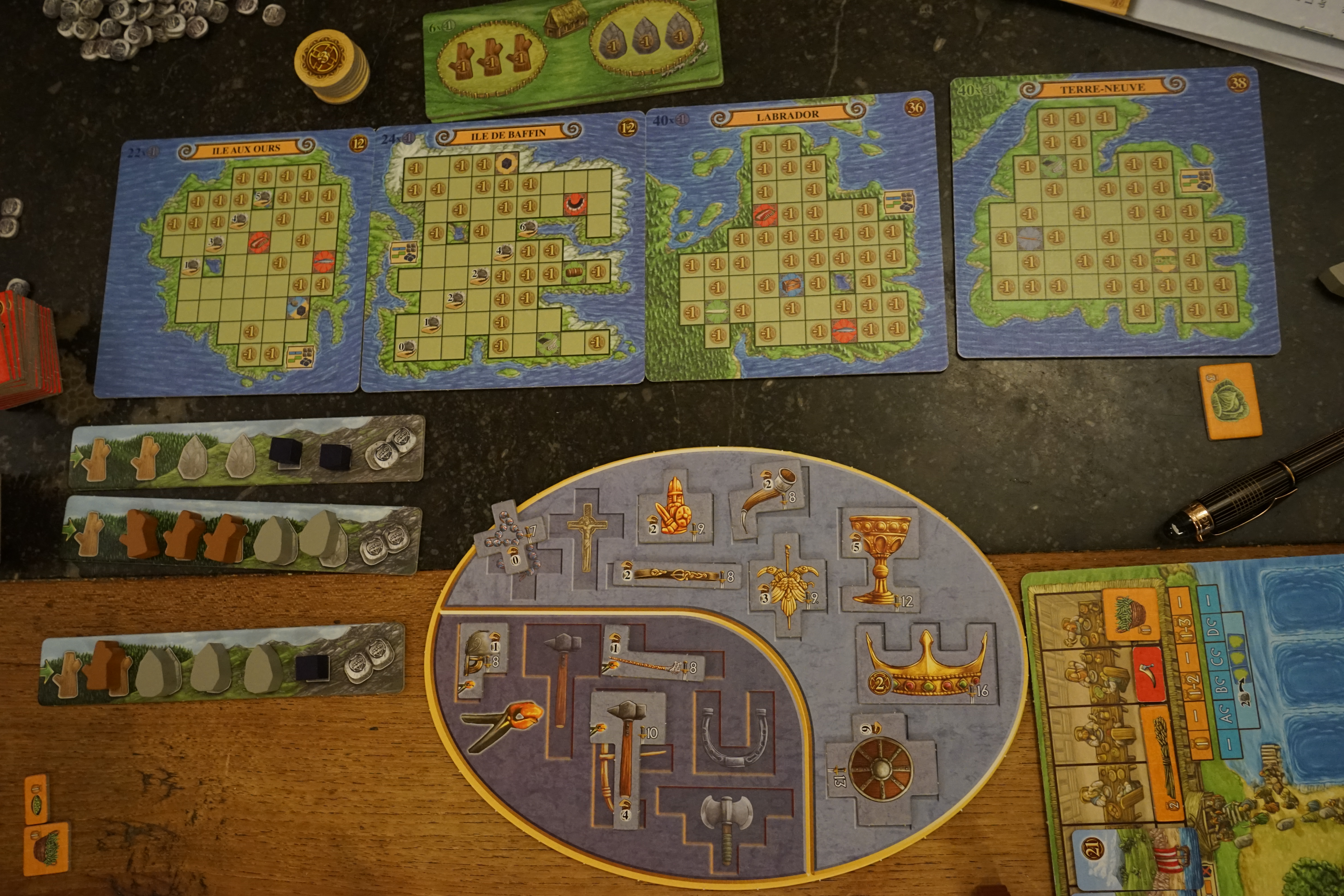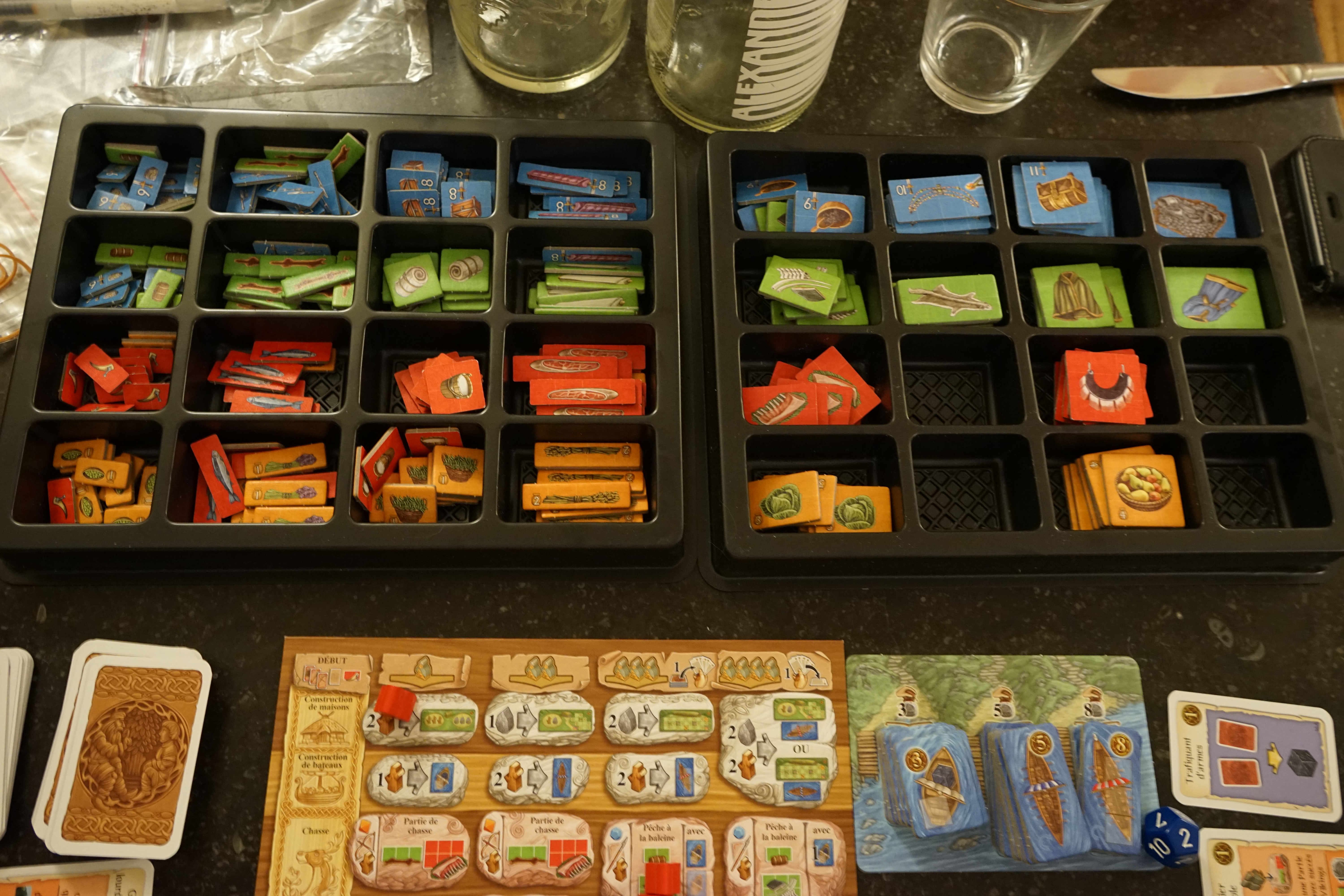 – le matériel est surabondant (et assez beau pour ma part), avec des tuiles représentant les dizaines de ressources, bateaux, flancs de montagne, argent, nouvelles constructions différents… C’est un plaisir de récolter une tuile chou, et pas « un cube jaune qui sert à nourrir vos vikings ».