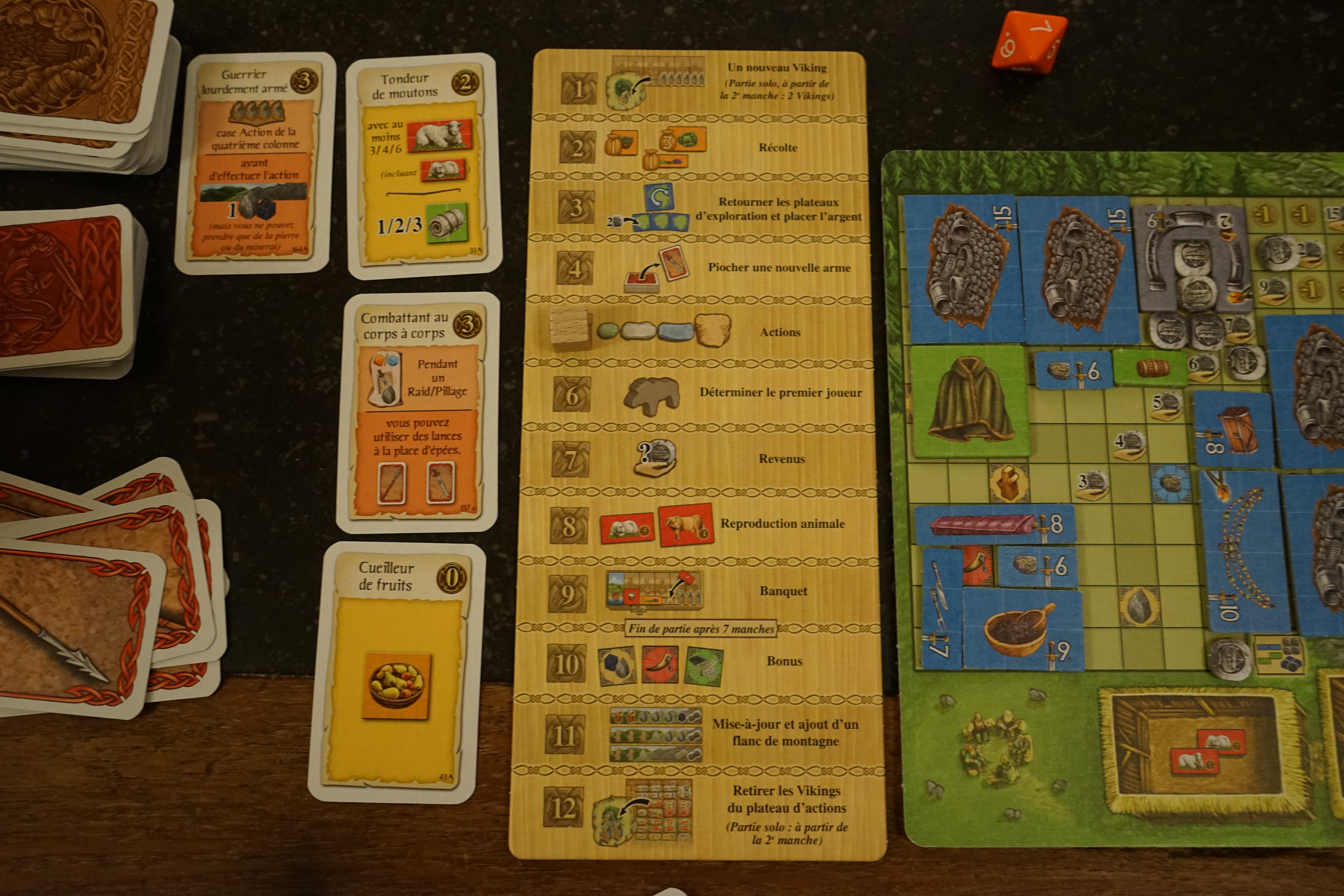 Quant au solo, le joueur effectue les 7 manches avec 2 ensembles de pions de telle sorte que les vikings posés sur une manche restent sur le plateau la manche suivante, bloquant ainsi certaines cases action.