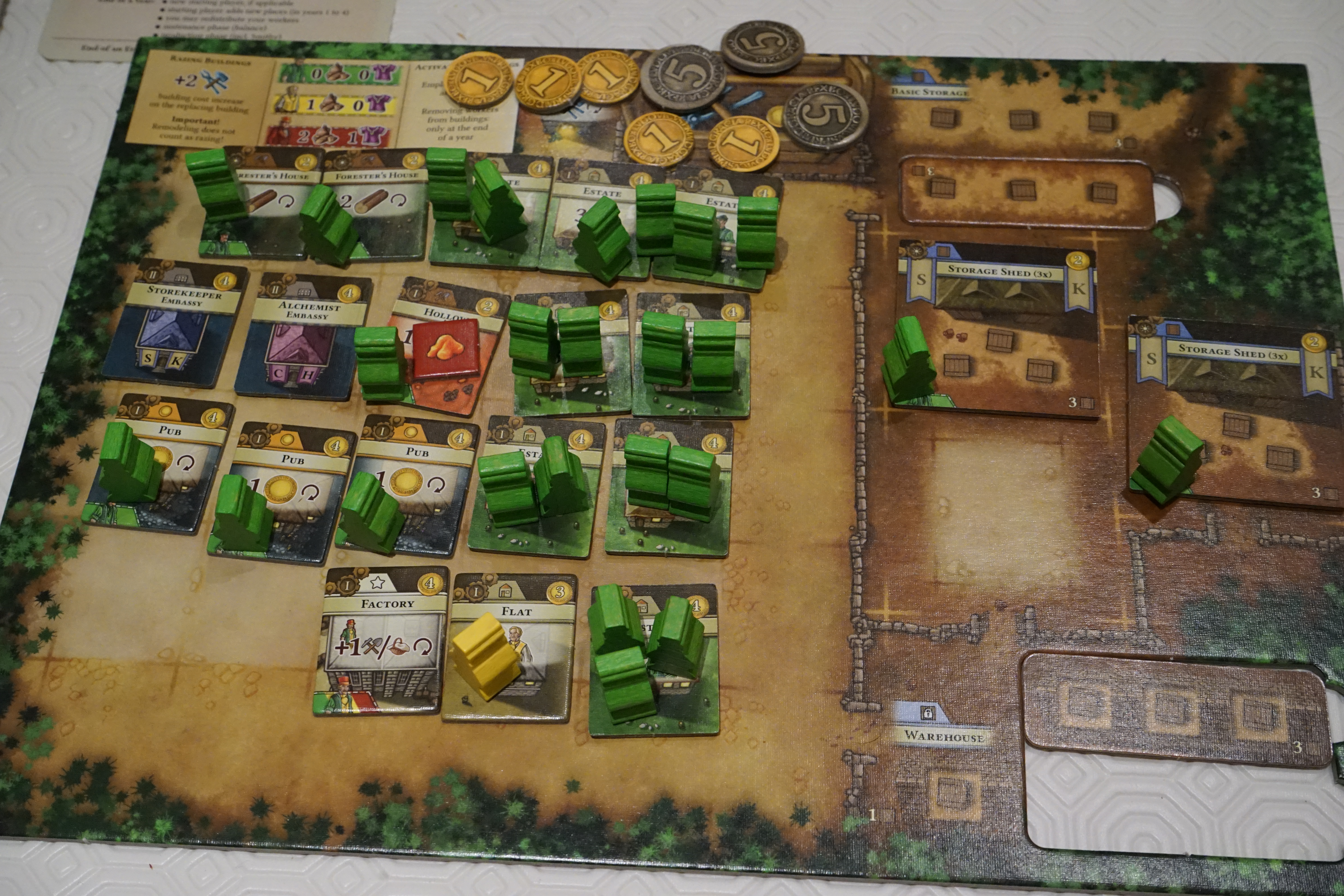 Contre des ressources et en réalisant l’action associée, on peut retourner un bâtiment côté verso. Le bâtiment devient alors beaucoup plus puissant. Cet aspect qui semble anodin (pourquoi ne pas construire tout simplement un nouveau bâtiment ?) apporte une profondeur supplémentaire au jeu car vous allez construire des bâtiments, non pas seulement pour l’effet qu’ils apportent maintenant mais pour les bénéfices qu’ils génèreront lorsqu’ils seront améliorés.