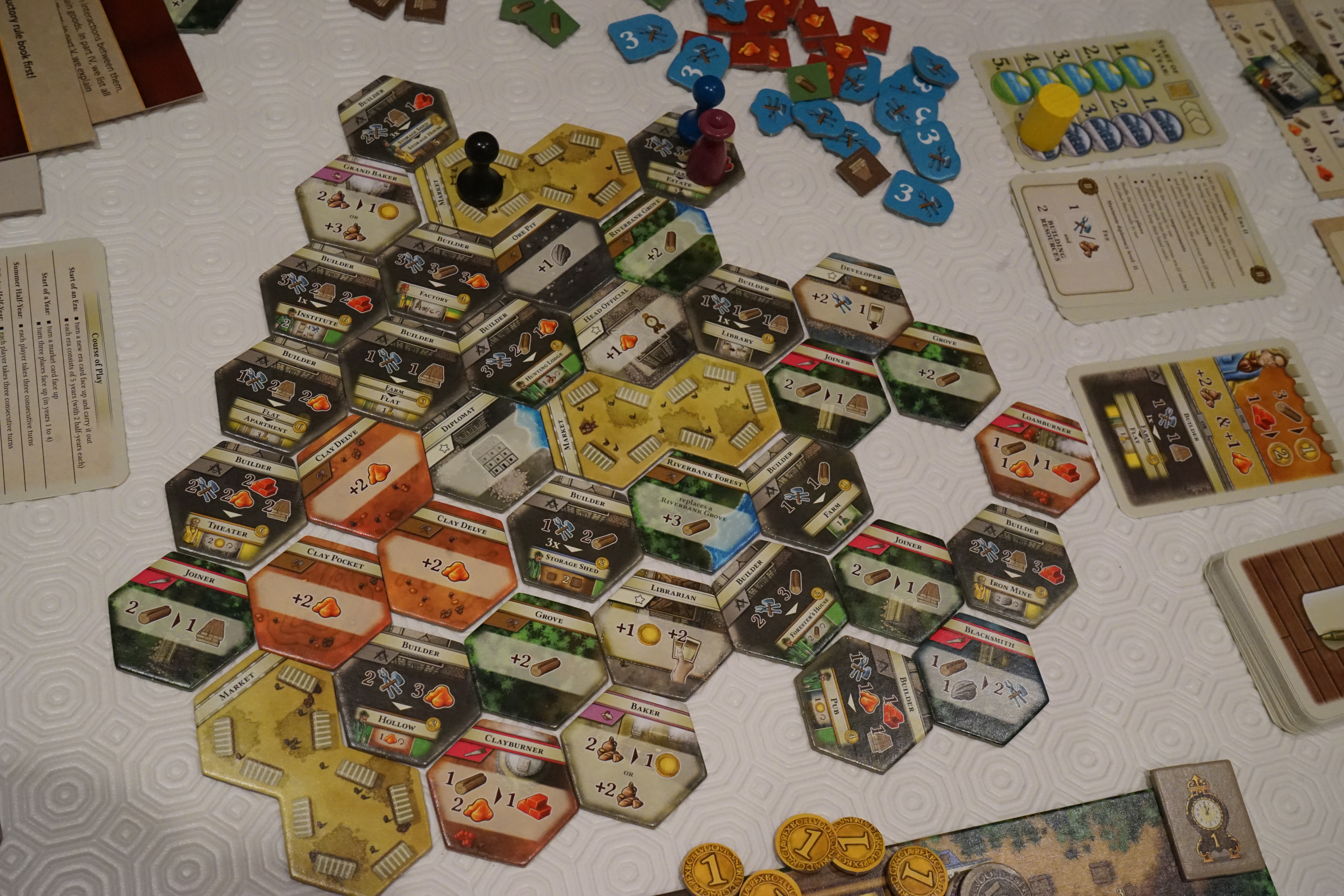 D’un côté la mécanique est fluide et le jeu mêle tactique et stratégie. Les options semblent nombreuses et les quatre ères du jeu proposent une évolution certaine (tuiles/cartes de plus en lus intéressantes).