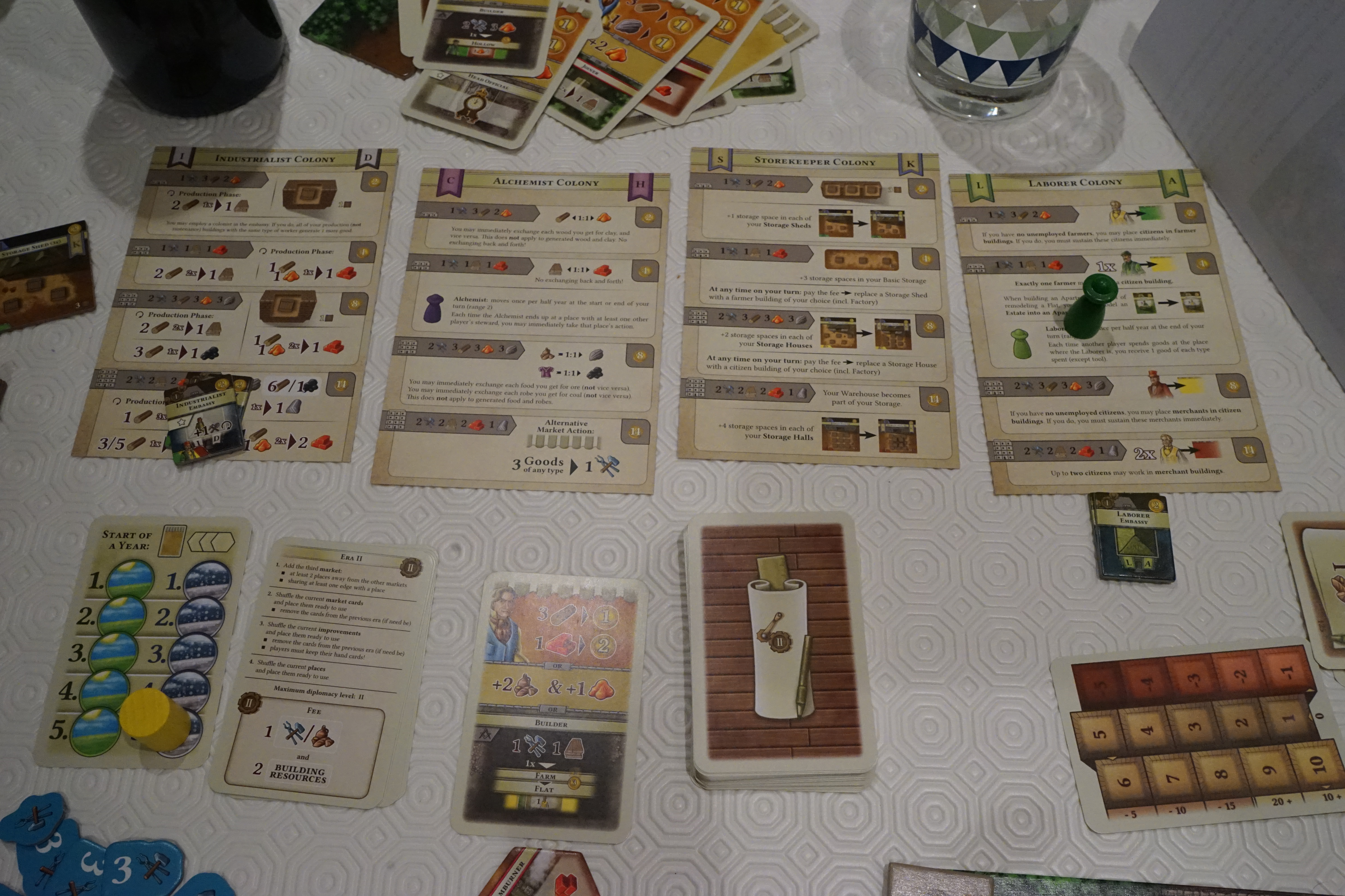 Une des grandes particularités de The Colonists est que les joueurs déterminent eux-mêmes la durée du jeu. Le jeu complet se joue en 4 ères mais les joueurs sont libres de jouer 1 seule, 2 ou même 3 ères. Et ils ne sont pas obligés de commencer à la première ère. Ca donne déjà pas mal de configurations différentes et il est claire que c’est une des grandes originalités du jeu. Ceci est bien beau dans la théorie mais dans la pratique, on remarque que le jeu est mieux équilibré si on le termine à l’ère 4. Je vous conseillerais alors de choisir le nombre d’ères que vous souhaitez mais de toujours terminer à l’ère 4. Ca réduit vachement les possibilités en effet mais le jeu y gagne en équité. Si vous vous arrêtez avant, vous risquez d’avoir un jeu poussif et répétitif où certaines actions seront inutiles car vous ne devrez pas vous préparer à l’ère suivante et d’autres combinaisons très fortes vous obligeant à les réaliser encore et encore (bien que totalement inutiles si vous jouez l’ère suivante).