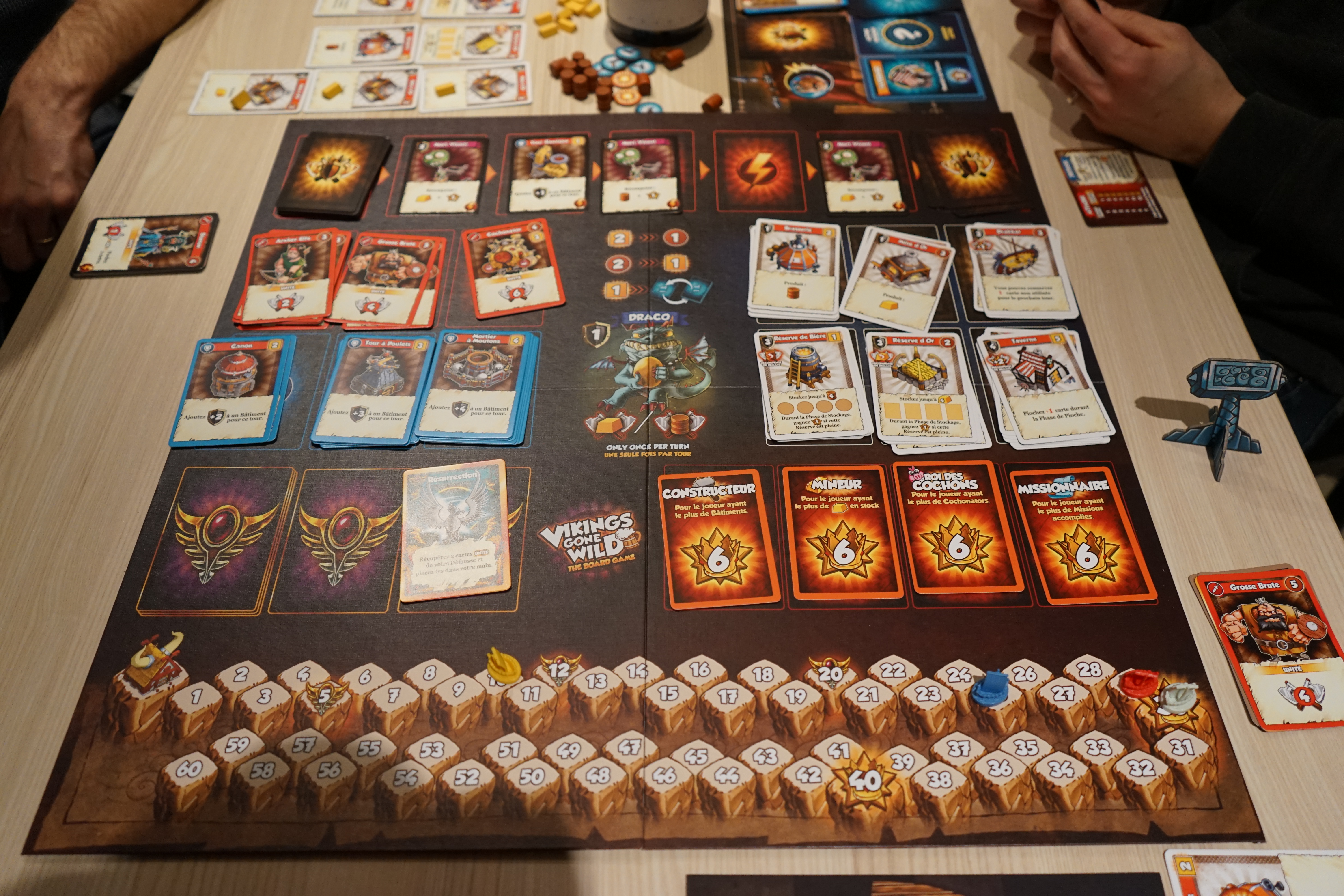 Dans Vikings Gone Wild on incarne des chefs de clans qui veulent prouver aux Dieux qui est le plus malabar. Le mécanisme de base du jeu est le deckbuilding, saupoudré de gestion de ressources. On va donc jouer avec un deck de cartes, qu’on va essayer d’optmiser pendant la partie pour être le premier à atteindre l’objectif de points de victoire.