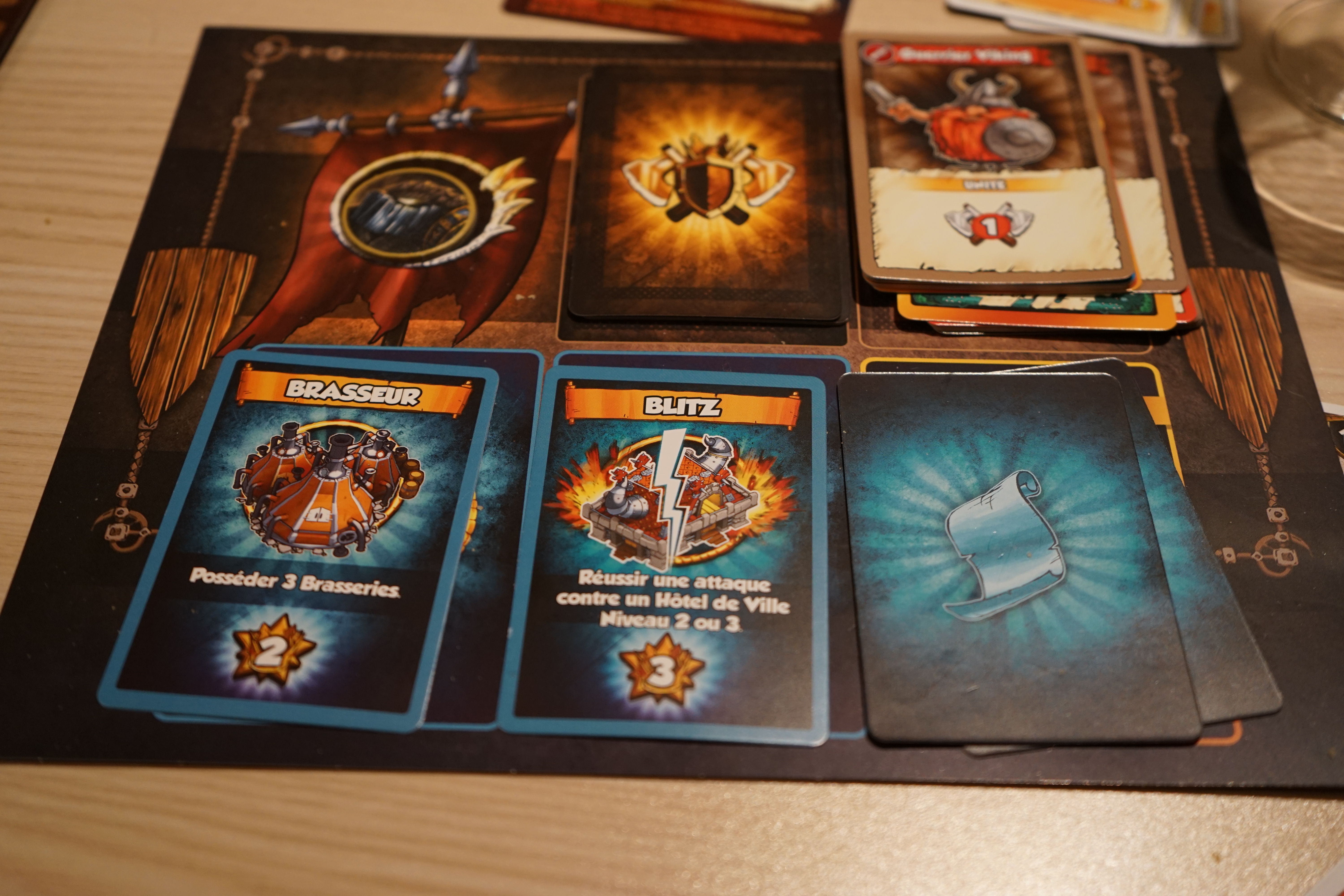 Ces cartes représentent des petits challenges (acheter tel type de carte, attaquer tel type de bâtiment, gagner tel type de ressource,…) Ces cartes vont guider légèrement vos actions car vous allez pouvoir gagner quelques PVs supplémentaires en les complétant sans pour autant être primordiales dans votre stratégie. Bien vu ! Il est juste très dommage qu’elles soient en nombre si limité et qu’on ne puisse plus en piocher dès le milieu de la partie.