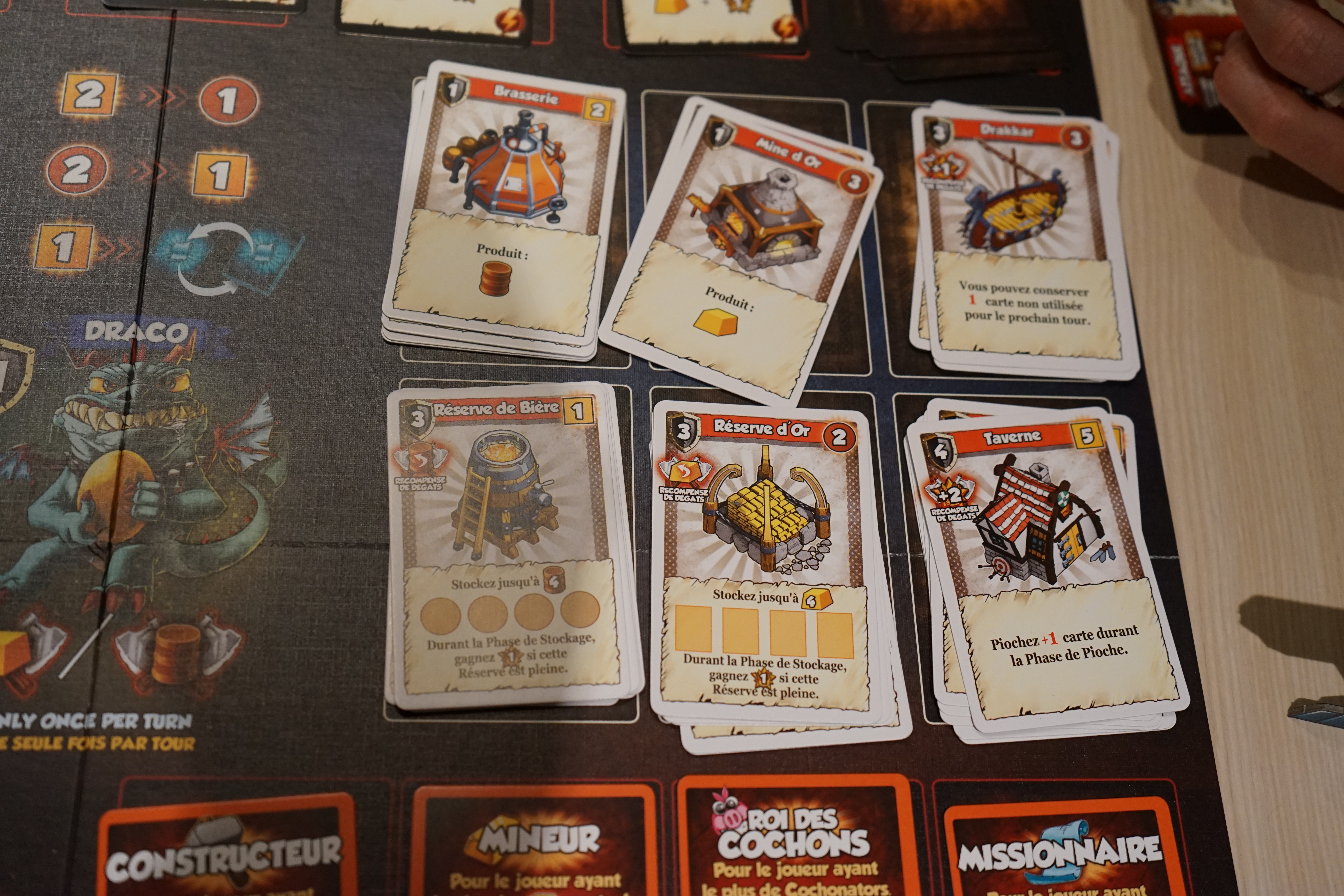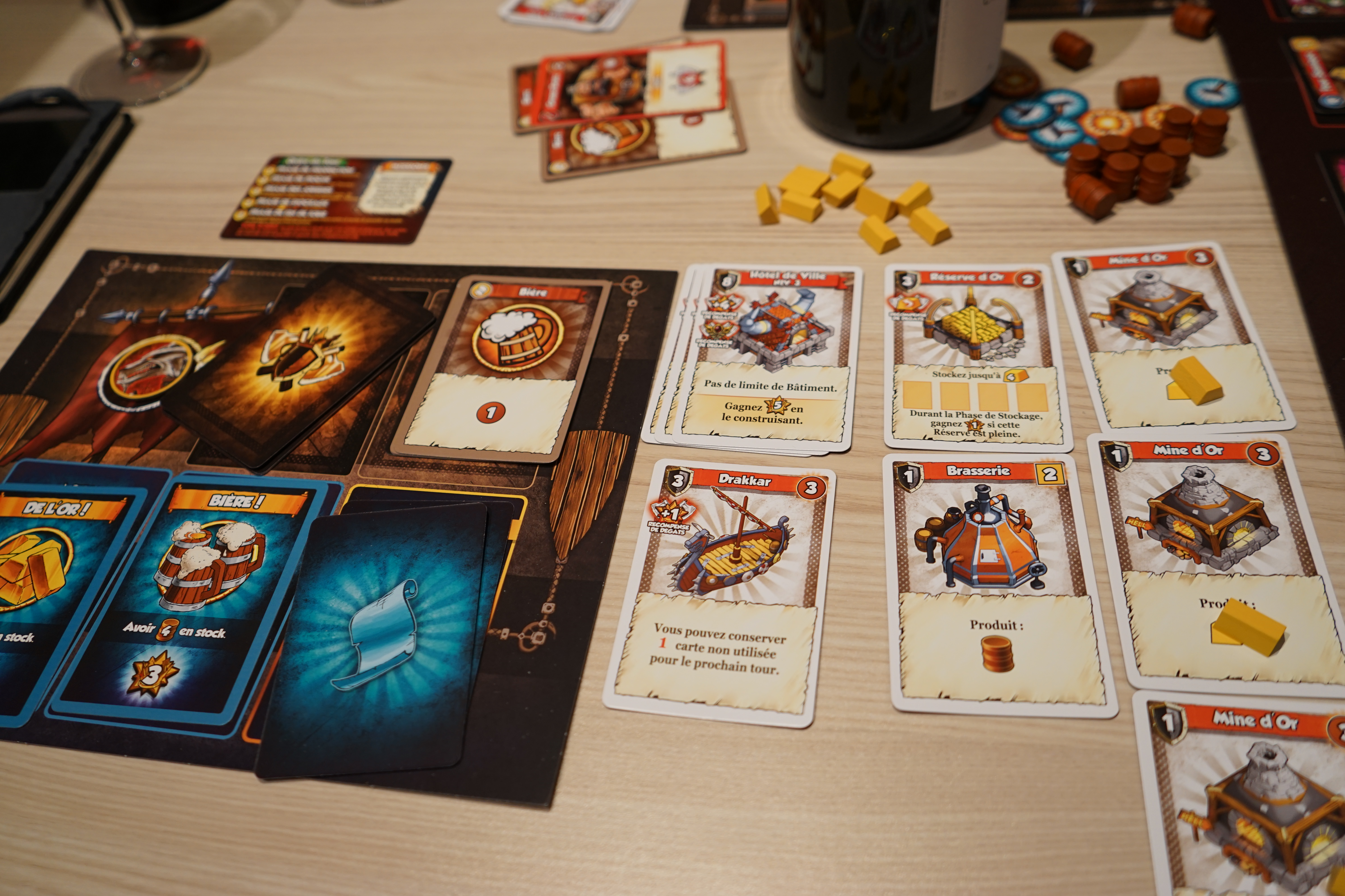 2. construire des bâtiments (= poser la carte correspondante devant soi, ce qui donnera un bonus aux tours suivants, e.g. piocher une carte en plus, recevoir un or, recevoir une bière, pouvoir stocker un or ou une bière d’un tour à l’autre…)