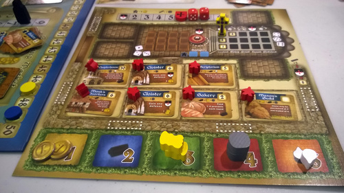 Avec ses dés moines, une joueuse va pouvoir réaliser une série d’actions différentes qui vont de la récolte de ressources, en passant par leur transformation pour être dépensées pour construire son abbaye, partir en croisade, défendre l’abbaye contre les forces des ténèbres et engager de nouveaux paysans qui pourront récolter encore plus de ressources pour mieux construire l’abbaye mais qu’il faudra également nourrir d’autant plus. Et cette nourriture supplémentaire devra être récoltée… Ce n’est pas pour rien que je vous parlais d’Agricola 😉