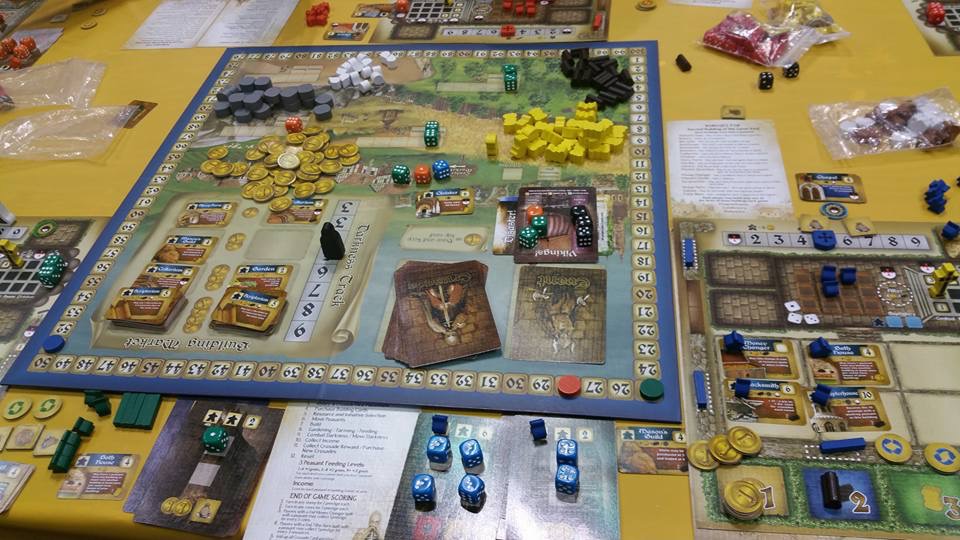 Tout commence par une phase où les joueuses vont jeter leurs 9 dés. Ce sont leurs moines 🙂 . Mais contrairement à Troyes, vous n’allez pas pouvoir acheter les dés adverses qui vous intéressent ni, tout comme dans les jeux de Feld, changer leur valeur. Non, dans King’s Abbey, vous allez devoir « faire avec » 😉 Et que faire ? La valeur des dés est en effet importante car certaines actions ne pourront être exécutées qu’avec des dés de valeur 1 à 3 tandis que d’autres nécessiteront des valeurs allant de 4 à 6. De plus, King’s Abbey a un système proche de celui de l’Age de Pierre pour la récolte de ressource où on va diviser la valeur des dés par 2, 3, 4,… en fonction du type de ressource récolté. Autant dans ce cas, bien jouer et lancer des dés de haute valeur 😉 Enfin, les dés serviront également à une phase semi-collaborative où les joueuses devront se battre contre les forces des ténèbres, les vikings, et là, il faudra avoir des dés de valeur égale à celles des dés vikings. Chaotique et difficile à prévoir bien que garder des dés de différentes valeurs est plutôt opportun ! On passe de l’Age de Pierre à l’Age des Ténèbres 😉