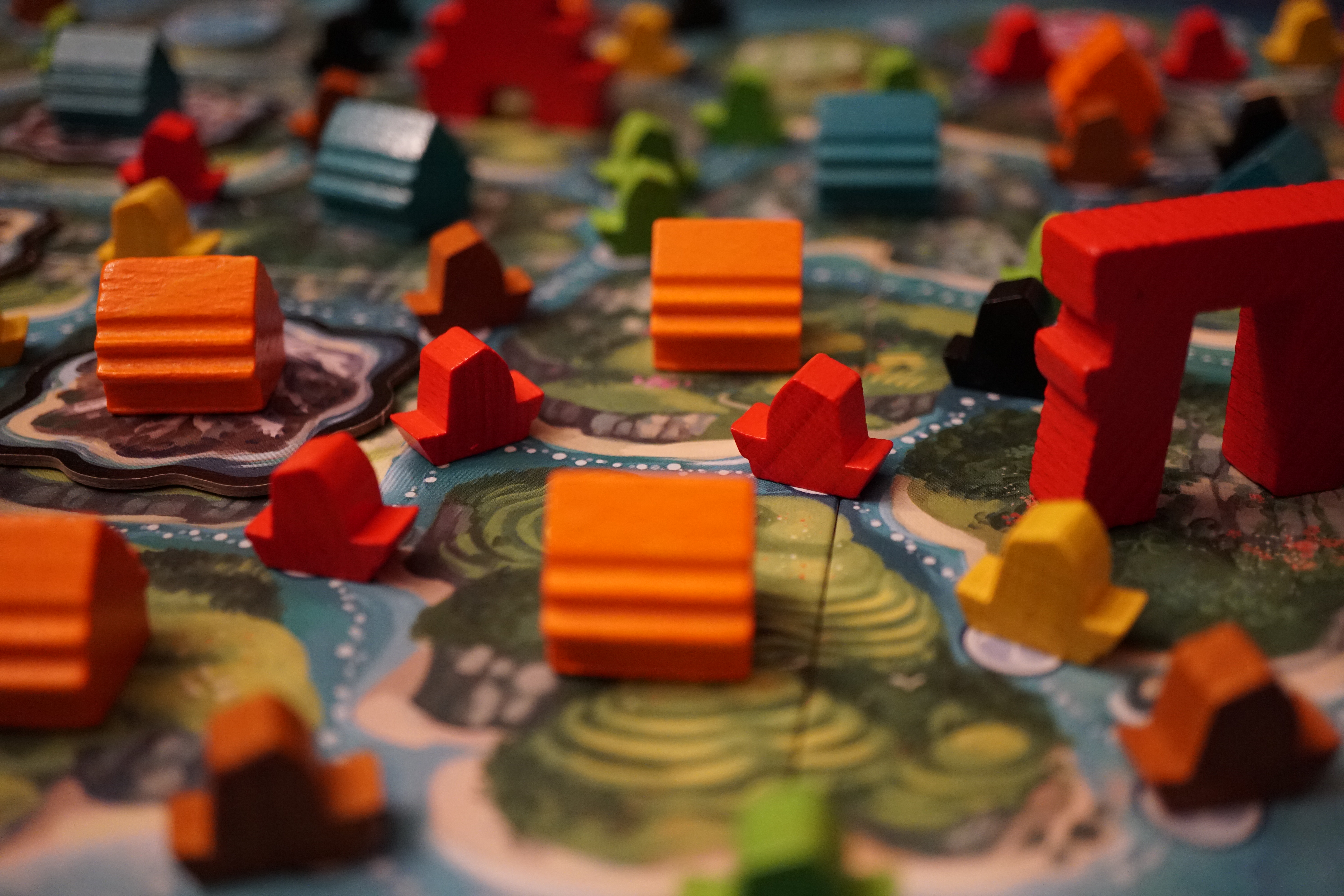 -Au bord du plateau sont disposés 5 bâtiments. Chaque bâtiment exige une combinaison spécifique de bateaux (ex : 2 rouges et 1 brun) et rapporte des PVs lors de sa construction. Si, autour d’une des îles, sont disposés des bateaux des couleurs exigées, la joueuse peut construire un de ses bâtiments sur l’île vide. De plus, si vous arrivez à construire vos bâtiments adjacents les uns aux autres, vous pourrez gagner des pièces qui vous permettront d’acheter de nouveaux bateaux.