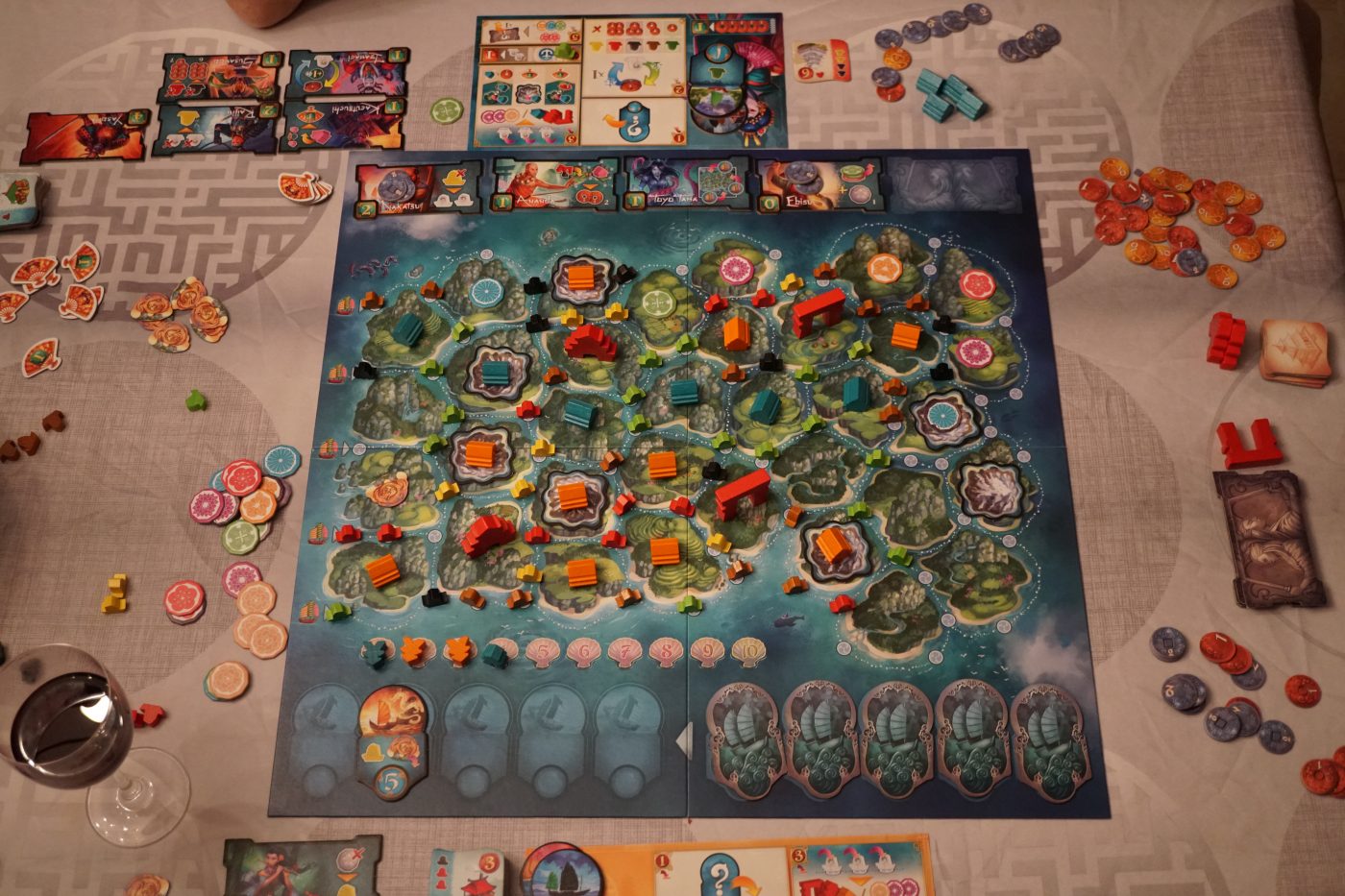 Certes les couleurs se recoupent un peu au niveau des pions, le packaging a une certaine ressemblance, avec son aide de jeu et, on va semer des bateaux comme on semait des meeples dans Five Tribes, mais l’ensemble est quand même bien différent. Personnellement, j’ai trouvé Yamataï plus subtil car il faut combiner le pouvoir d’une tuile bateau qui va déterminer l’ordre du tour, mais aussi les bateaux que l’on va recevoir à son tour pour les poser sur le plateau. En effet, dans Yamataï, on va déposer ces bateaux à la suite des autres pour naviguer entre des îles et obtenir des ressources ou de l’argent ou construire des tuiles bâtiments afin d’obtenir des points de victoire. Bien entendu, on aura le fameux « plus tu es puissant, plus tu joueras en dernier au prochain tour ». Les ressources nous apporteront des pouvoirs au cours de la partie.