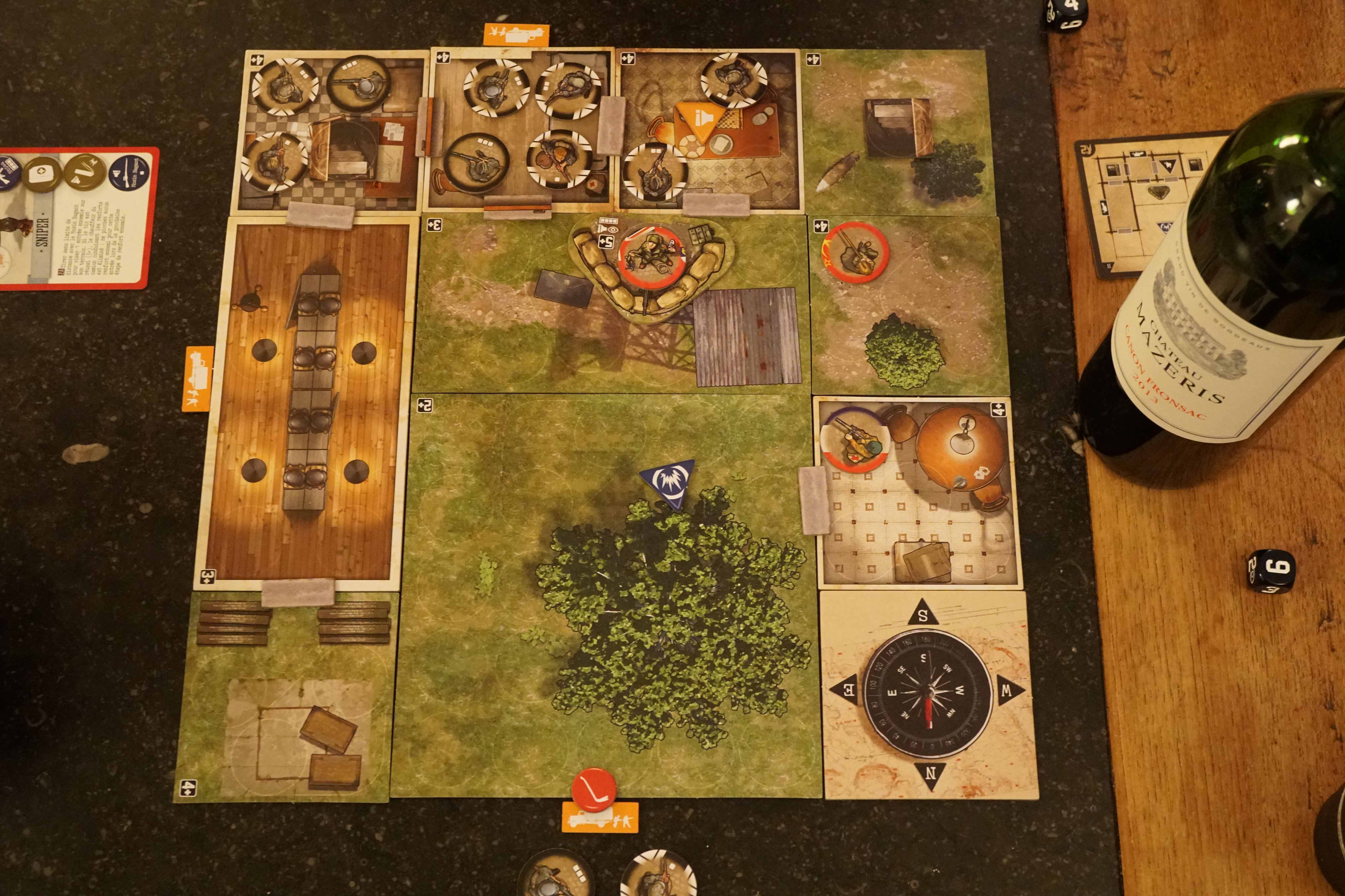 Dernier élément que je voulais souligner sur V-Commandos est son système de « rondelles ». On ne le remarque pas comme ça quand on regarde un plateau de mission en photo mais les tuiles paysage sont occupées par des cercles. Même si on dirait le contraire, on ne place pas ses personnages à des endroits en fonction d’une latte ou d’un ruban. Personnellement, je m’étais trompé en découvrant le jeu. Je pensais qu’il s’agissait d’un jeu de figurines, sans figurine, où on les déplaçait à l’aide de rubans et autres lattes. Je dois avouer que je suis moins attiré par ce type de jeu et quand je vois des cases, ça m’attire directement plus 😉 Et V-Commandos ne m’a pas attiré au début car je pensais qu’il s’agissait d’un jeu dans ce style. Mais il n’en est rien ! Chaque tuile comprend 4, 8 ou 16 cercles où l’on place les commandos ou les soldats Allemands. Peu importe la rondelle où on le place. L’important c’est la tuile où il se trouve. Les ronds indiquent juste le nombre maximum d’unités que peut contenir la tuile. Et la tuile où se trouve l’unité va indiquer si l’unité est visible ou non et par qui. Les unités vont se déplacer de tuile en tuile grâce à des points de mouvement et non à des lattes ou autres dés.