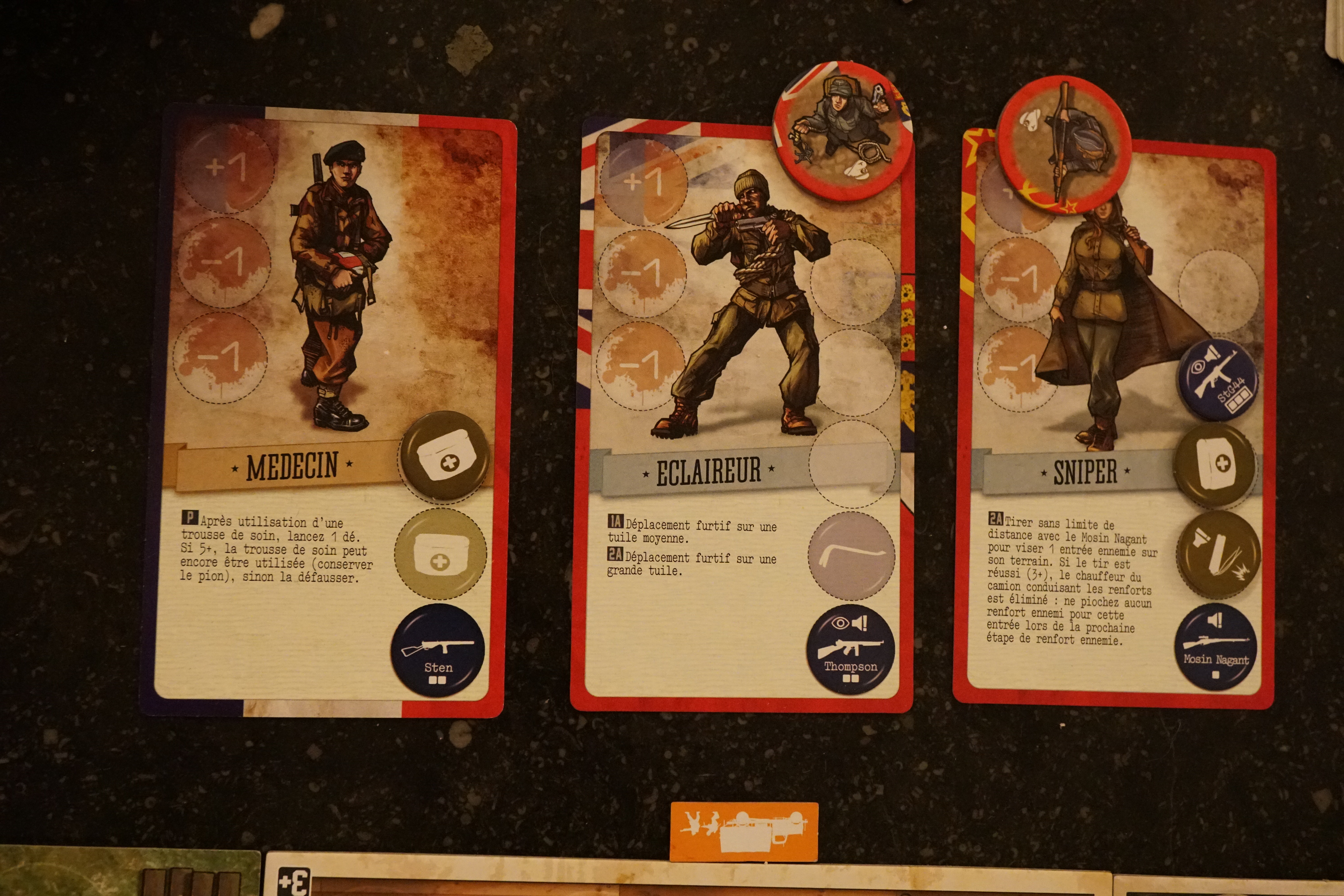 Chaque commando aura des capacités spéciales différentes (l’un aura une trousse de secours au départ, un autre aura la faculté de générer un « tir gratuit » pour un autre commando grâce à ses facultés de leadership…) et devra être choisi soigneusement au début de la partie pour former une équipe complémentaire. On peut également mentionner qu’il y a la possibilité d’être furtif selon le type de terrain (pas moyen de rester furtif sur un grand terrain), qu’il y a des équipements divers à utiliser (trousse de secours, pied de biche, armes diverses et variées, silencieuses ou pas, portes, charge de tnt…), qu’il y a plusieurs types de Fritz, qu’on peut revêtir des uniformes de Fritz pour passer inaperçu… Il faut aussi dire que les tirs se résolvent à coup de lancers de dés, mais que ça ne pose aucun problème (la chance est très limitée), si ce n’est évidemment qu’on peut se retrouver blessé voire dans un état critique…