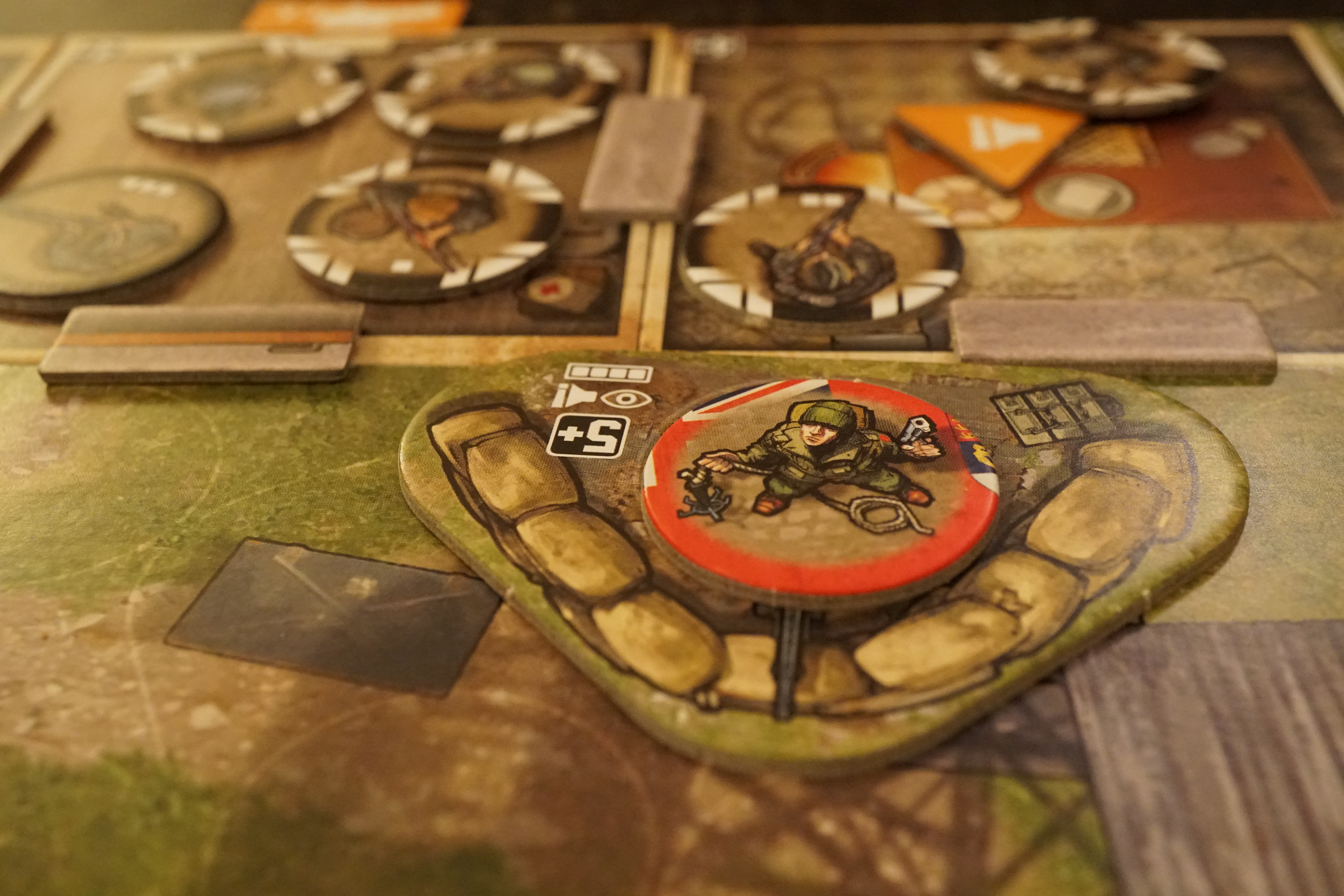 2. la phase commandos, où les commandos vont réaliser leurs actions. Ils ont 3 points d’actions qu’ils vont utiliser pour réaliser différentes actions: se déplacer, se déplacer furtivement, sortir par une trappe, débloquer une trappe, attaquer en combat rapproché, tirer, utiliser un équipement, éteindre une alarme, interagir avec un objectif ou économiser un point d’action pour le tour suivant.