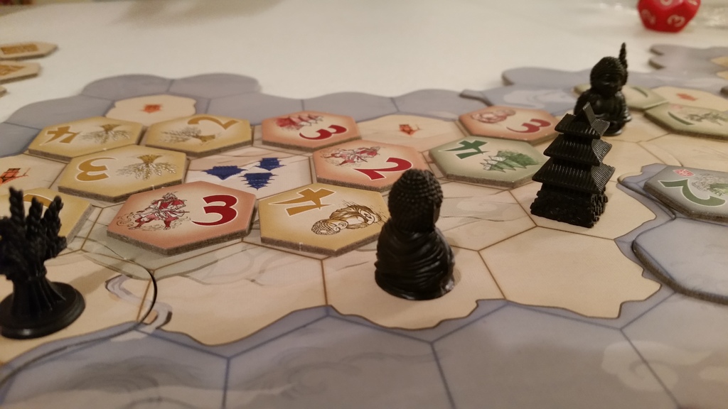 Chaque joueuse dispose d’un même stock de tuiles et en tire 5 au hasard.  Les joueuses auront donc accès aux mêmes tuiles mais dans un ordre aléatoire différent.  Ces tuiles montrent 1 chiffre ainsi qu’un ou plusieurs types d’influence (commerce, religion et militaire).  Chaque joueuse, à son tour, va placer une tuile (ou plusieurs si elle dispose de tuiles avec la mention « rapide » qui peuvent être jouées en plus de la tuile principale) dont le type d’influence correspond au tuile de la figurine adjacente, et prend la ou les figurines éventuelles (placer une tuile commerce autour d’un commerce par exemple).  Dès qu’une figurine est entièrement entourée de tuiles joueur, on effectue le décompte de la majorité.  On additionne les chiffres de tuiles de chaque joueuse et celle qui détient la majorité, gagne la figurine.  C’est là d’ailleurs l’objectif du jeu : détenir la majorité des figurines de chaque type.  Une joueuse qui détient la majorité de 2 des 3 types de figurines l’emporte. 1519 Samurai 3