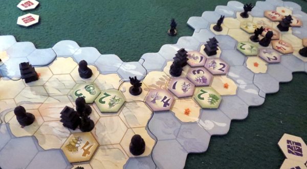 Et voilà, Samourai n’est pas plus compliqué que ça !  Il faut néanmoins ajouter quelques petites particularités comme des samourai qui sont des jokers et qui influencent les 3 types, les bateaux qui peuvent être placés sur l’eau et des tuiles bonus qui permettent d’échanger 2 tuiles ou 2 figurines.  Mais le jeu reste toujours très simple.  Il désarçonne tant il est simple d’ailleurs et tant on n’a plus l’habitude de jouer à des jeux si simples.  Ce n’est pas pour rien qu’il est considéré, avec El Grande, comme étant un des meilleurs jeux de majorité.  On pourrait oser affirmer que Samourai est l’essence même du jeu de majorité et que, depuis lors, les jeux de majorité ont brodé autour de ce principe.