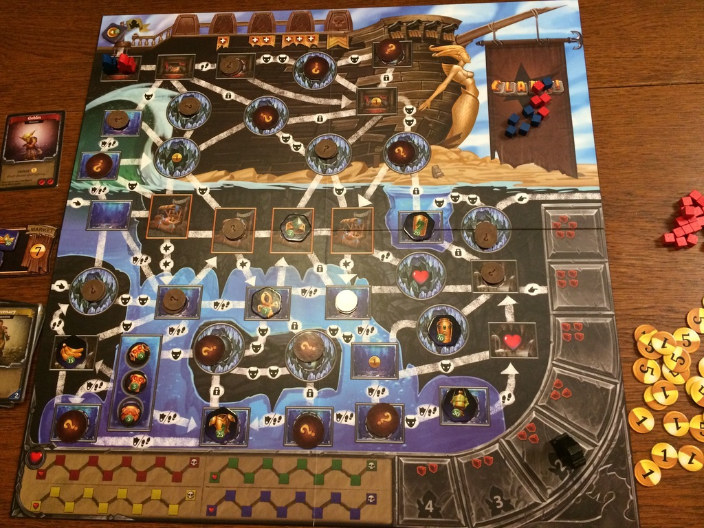 Il montre une sorte de bateau avec de la terre sous lui et de l’eau à sa gauche et en dessous de la terre. Ce plateau étrange permet de nouvelles choses bien entendu mais au détriment du thème. Ce thème du donjon et de son sous-sol que nous appréciions particulièrement dans Clank s’envole en éclats avec cette extension et c’est un peu dommage. On n’est plus dans un donjon mais dans une sorte de bateau puis on plonge dans de l’eau avec des endroits sous-terre. Et dans cet univers proche des pirates, il n’y a aucun Kraken mais bien toujours un dragon qui se cache sous l’eau !!!
