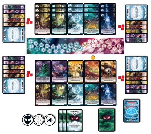 Le jeu est asymétrique. Le joueur qui incarne la créature et la planète en symbiose, est seul contre nous tous, mais il a de puissants pouvoirs et peut parfois deviner nos intentions par déduction de nos cartes restantes.