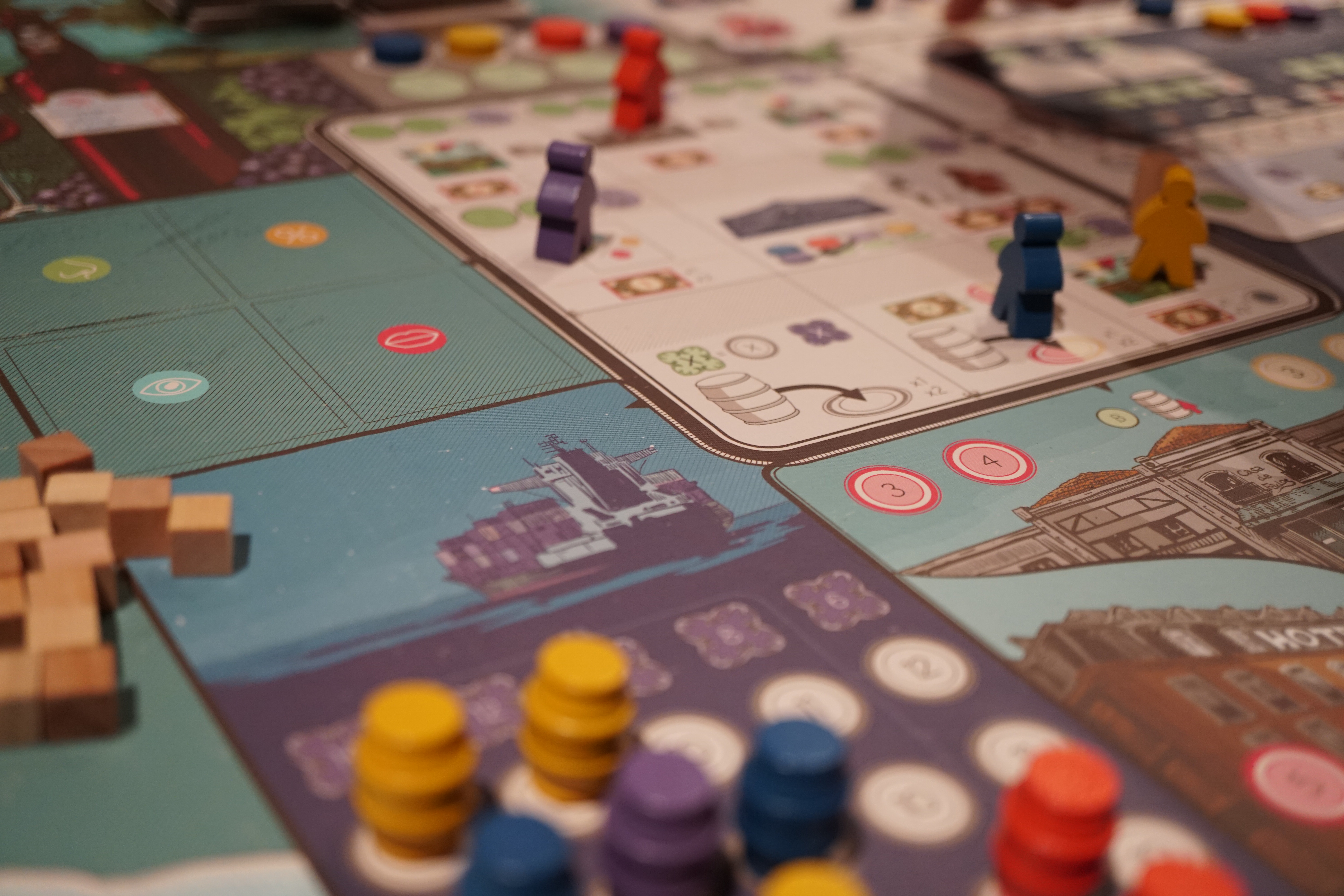 Tout d’abord adieu la banque du 1er opus et sa gestion assez complexe et punitive. Cet élément constituait un paramètre de plus à gérer pour avoir du cash. En la supprimant Vinhos Deluxe, va dans le sens de la simplification. Ainsi, il rend le jeu plus accessible à un plus grand nombre de joueurs et contribue également à le rendre moins punitif. Je comprends cette modification même si je préférai la version avec la banque. En effet, cela offre un challenge supplémentaire de maîtriser et bien gérer cette mécanique qui conditionnait largement le bon déroulement de la partie.