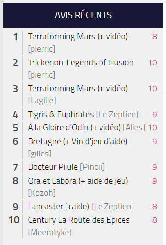 Voilà pourquoi nous avons ajouté un onglet dans la colonne de gauche : Les avis récents, soit vos 10 derniers avis.  Vous pouvez donc y voir vos avis donnés récemment que la fiche du jeu soit nouvelle ou ancienne.