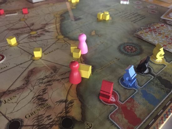 La péninsule Ibérique étant une péninsule 😉 , elle est quasi complètement entourée d’eau. Un personnage peut dès lors voyager en bateau d’un port à l’autre en défaussant la carte du port de destination.
