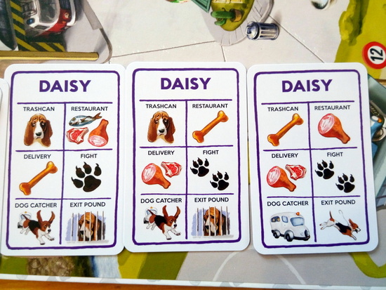 -S’il finit son mouvement sur une case adjacente à un chien, ce dernier tente de se cacher en retournant sa carte et en regardant le résultat dans la case concernée. S’il est chanceux rien ne se passe pour lui, sinon c’est la fourrière !