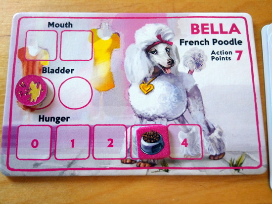 2 – Sur le plateau individuel de son chien apparaît le nombre d’actions possibles. Le jeu est asymétrique et chaque chien aura ainsi un nombre d’actions différentes, ainsi que des prédispositions favorables à l’une ou l’autre de ses actions. Cela rend le jeu plus amusant et colle bien avec les différentes races de chien utilisé dans le jeu. Il n’y a bien évidement aucun report de points d’un tour à l’autre.