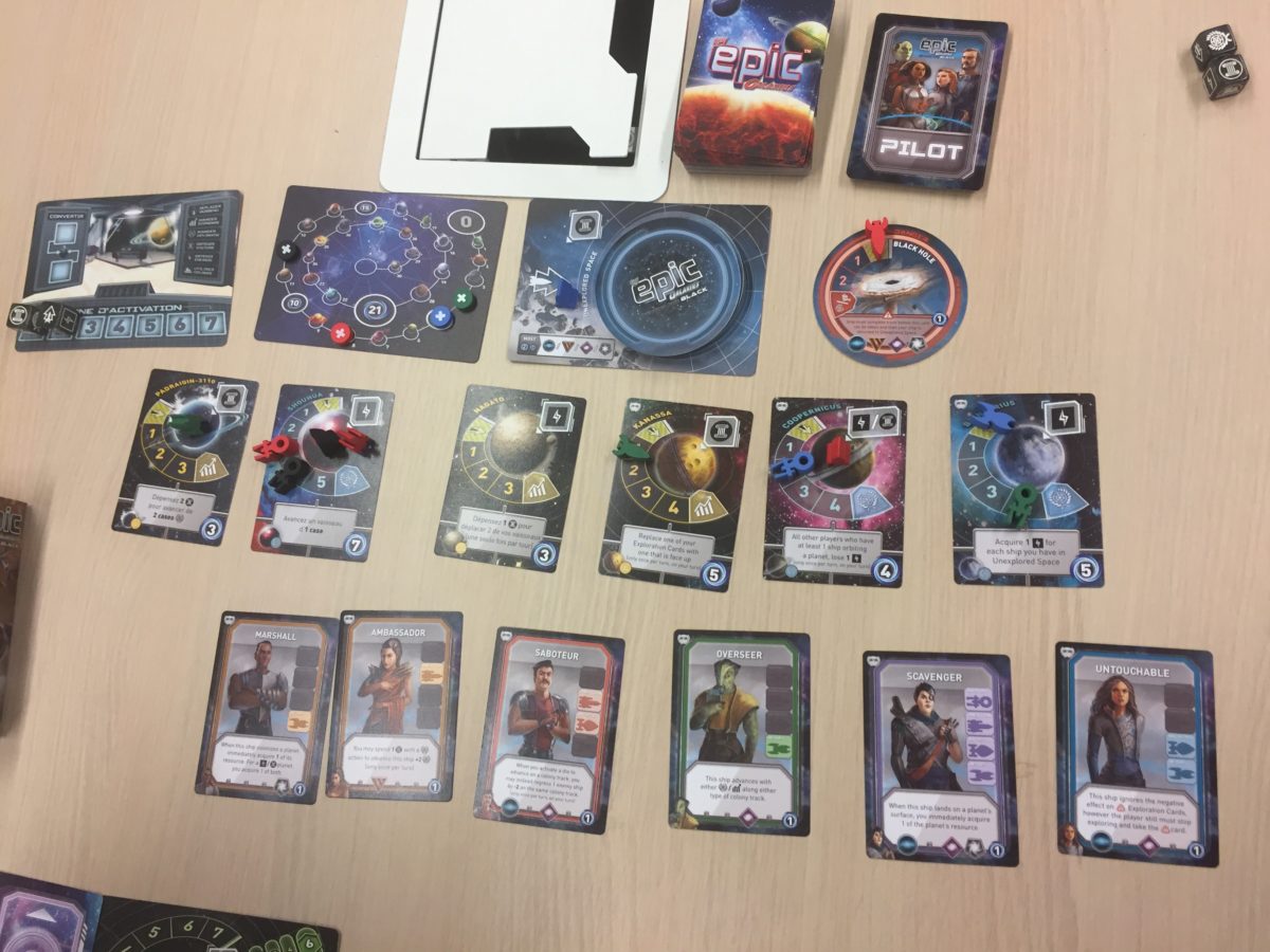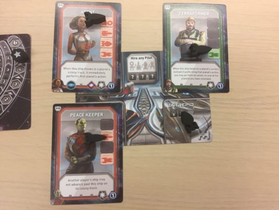 Voilà une idée qui est géniale ! C’est très bien d’avoir des fusées pilotées automatiquement mais rien de tel qu’in vrai pilote ! Ils sont disposés au centre de la table comme les planètes en fonction du nombre de joueuses +2. Une nouvelle action voit le jour : engager un pilote. Les coûts d’engagement sont de 2 cubes identiques. Lorsqu’on engage un pilote, on place sa carte sur son hangar et on remplace une de ses fusées par une fusée de forme spéciale (voir photos) et unique de telle sorte qu’on sait exactement quel vaisseau est conduit par quel pilote. Chaque pilote a un pouvoir qui ne s’applique qu’à la fusée qu’il dirige : empêcher toute autre fusée de le dépasser en orbite, pouvoir réaliser l’action d’une planète même en orbite, gagner 2 ressources produites par la planètes lorsqu’on la colonise, voler une énergie à chaque vaisseau présent sur la planète où on est,…