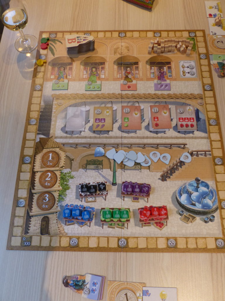 Parfum est séduisant par son thème peu exploité à ce jour. Il n’innove pas dans ses mécaniques, restant on ne peut plus classique. Ses règles sont facilement assimilables et une partie est d’une durée bien raisonnable. Et c’est bien ainsi car il deviendrait alors trop répétitif. Il se jouera mieux à 3 ou 4 joueurs. En effet, à 2, l’ordre du tour prend une trop grande importance. Cet ordre est défini au début de chaque tour en choisissant un jeton. Et c’est la joueuse avec le moins de PV qui choisit en premier.