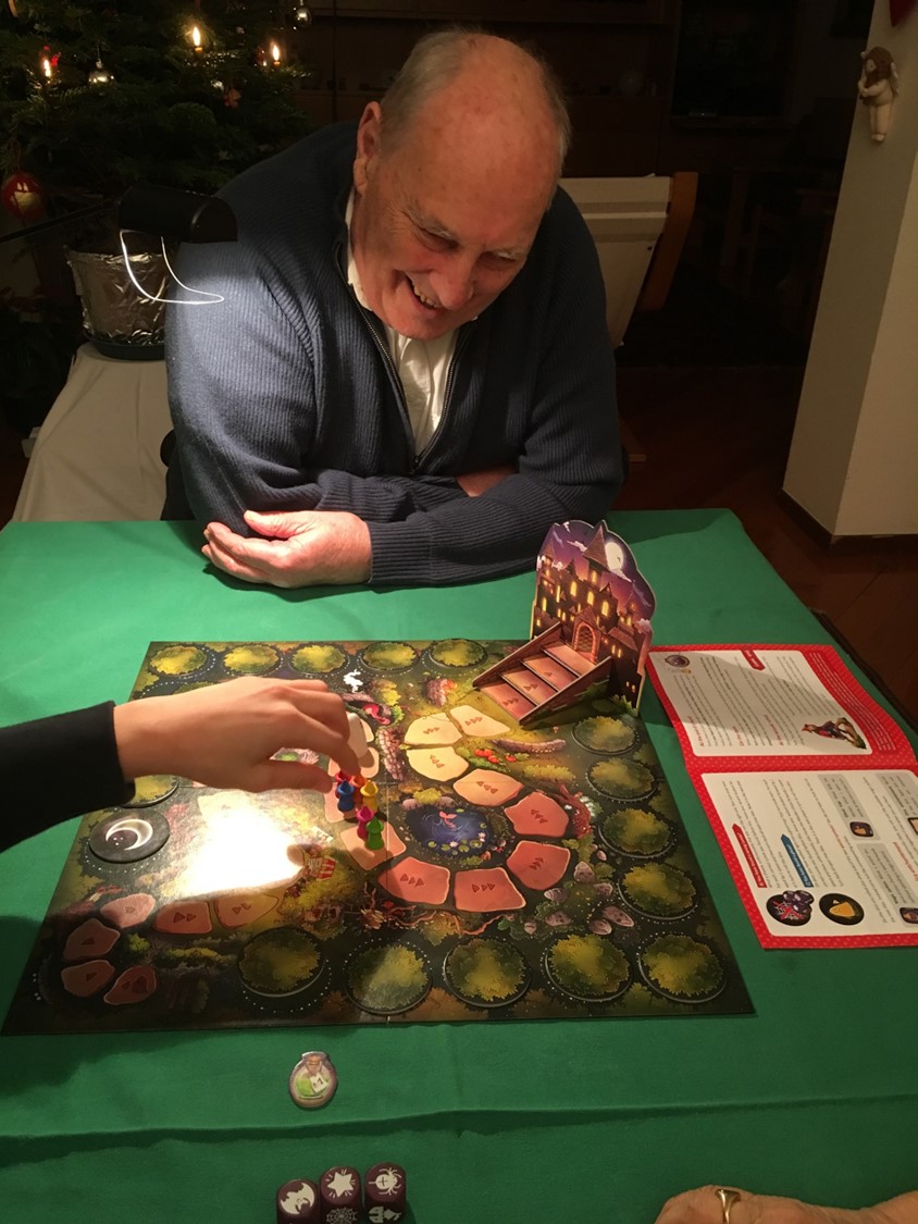 Pour avancer, il faut retrouver sous la forme d’un memory des tuiles (pardon, des arbres) cachées / les joueurs n’en connaissent que quelques-unes. À son tour, le joueur lance les dés et essaie de trouver l’arbre correspondant. L’aide des autres joueurs est acceptée. Bien entendu, en cas d’échec, on fait avancer Willi ! Dans la dernière phase du jeu, en montant les marches pour entrer dans l’école, chaque joueur est laissé à lui-même, et doit choisir quel arbre il révèle…