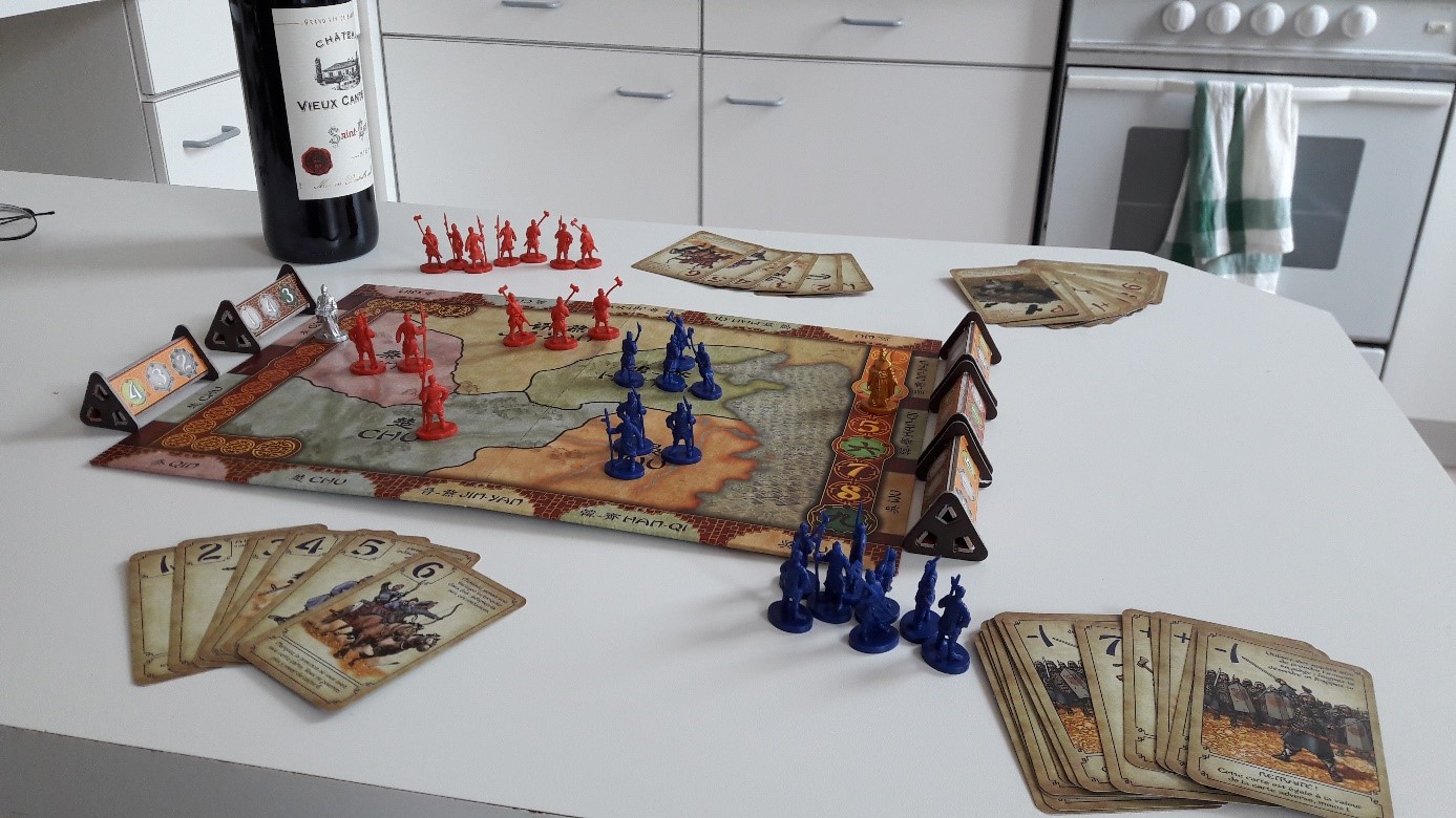 Maintenant, comment poser ces armées sur les territoires ? Dans notre main, nous avons des cartes de base numérotées de 1 à 6, ainsi que de quelques autres cartes spéciales. Secrètement, lors d’un tour de jeu, nous allons placer une carte face cachée en face de chacun des 5 territoires. Lorsque les deux joueurs ont fait cette action, on dévoile les cartes et le plus fort l’emporte sur chaque territoire et l’on place sur celui-ci autant d’armée qu’il y a d’écart entre les deux chiffres. Par exemple, sur le territoire Chu, j’ai posé une valeur 5 et mon adversaire une valeur 2, je peux donc poser 3 armées sur le territoire. A cela se rajoute des cartes spéciales que l’on peut également jouer, comme la carte « peste » qui enlève la moitié de l’armée présente sur le territoire.