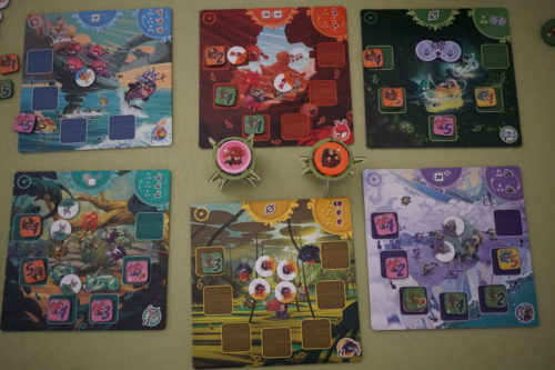 La première difficulté vient du fait que chacun des 6 plateaux a sa propre règle de majorité. Certaines majorités ne seront valables que si la valeur totale des grumpfs ne dépasse pas 10, d’autres si elle est entre 10 et 20 et d’autres encore que si elle dépasse 20,… Il va vous falloir bien faire attention à ces petites spécificités.