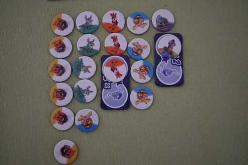Grumpf est en effet un simple jeu de majorité et de collection. Le but du jeu est d’amasser des animaux différents. A la fin du jeu, pour chaque série de 5 animaux différents qu’on possède, on gagne 6 PVs, pour 4 animaux différents, 4 PVs, pour 3, 2 PVs et pour 2 un PV. Un animal isolé ne rapporte rien.