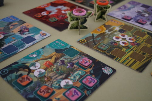 Pour gagner ces animaux il va falloir gagner des majorités. Grumpf nous présente 6 plateaux différents et sur chaque plateau, on va pouvoir récolter des animaux d’un type. Chaque joueur possède 8 grumpfs à sa couleur et va les placer autour de chaque plateau. Chaque Grumpf a une valeur. La joueuse majoritaire en valeur de Grumpfs recevra (normalement) plus d’animaux que les autres joueuses.