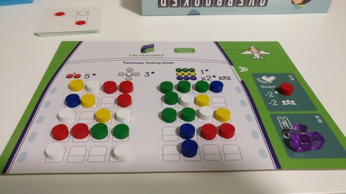 On prend ensuite les jetons passagers indiqués par la carte prise et on les place dans son avion en respectant les règles strictes de placement en fonction de la carte passagers prise. Si on ne sait pas faire autrement que de placer un passager sur un jeton passager existant, l’ancien jeton passager est enlevé et placé dans la section « overbook ». Et c’est pas bon 😉