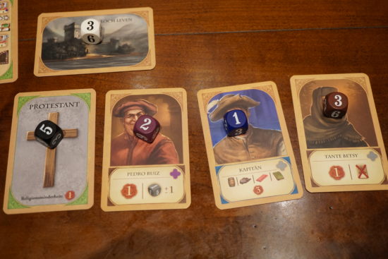 Chaque joueur dispose de 6 dés dont un dé religion. Ce dé, après avoir été lancé, se place sur sa valeur lancée sur sa carte religion. La carte religion de chaque joueur montre les valeurs Protestant ou Catholique. Avant de placer son dé sur sa carte religion, le joueur doit choisir à quelle religion il appartiendra. A chaque tour, la valeur du dé religion diminue de 1. Lorsqu’il passe à 0, on relance le dé religion et on peut, à nouveau, choisir sa religion et y placer son dé avec sa nouvelle valeur. Autrement dit, en cours de partie, on va être amené à changer sa religion en fonction des événements et à un rythme dépendant de la valeur du dé lancé. Même si les choix sont souvent assez évidents (on va choisir la religion la plus répandue à ce moment-là de la partie), on apprécie grandement cette mécanique qui, à elle seule, nous plonge dans le thème et nous autorise à retourner notre veste joyeusement 🙂
