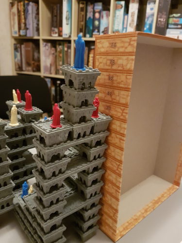 L’idée du jeu est assez simple, et ce sera accessible à tous. On est bien dans le jeu abstrait, sans que ce soit trop compliqué. J’ai trouvé le coup spécial d’inverser deux nobles à l’avantage du dernier joueur. Se voir rafler plein de points à la fin, c’est un rageant alors que vous avez eu un mal de chien à vous placer très haut. Peut-être ai-je mal joué ? La structure finale est gigantesque, mais sa stabilité demande de faire très attention quand vous construisez afin que tout ne s’écroule pas. Ceci a tendance parfois à vous déconcentrer en étant plus focaliser sur l’équilibre de la construction que de réfléchir à un coup pour des points. Il faudra d’ailleurs tourner autour de la table pour avoir une bonne vision, pas question de déplacer le tout à la main !