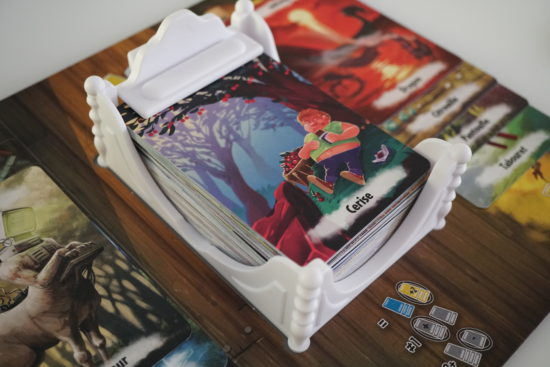 Le thème étant le rêve, quoi de mieux que d’y mettre carrément un lit… Je vous rassure, il ne servira que de sabot pour y piocher des cartes. Mais il faut l’avouer, ce sera du plus bel effet ! Les cartes seront également superbement illustrés par une palanquée d’artistes. Et même le masque est décoré…. Bref When I dream est beau !