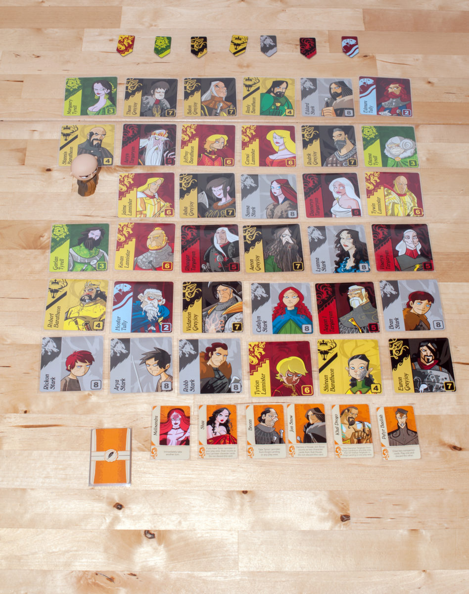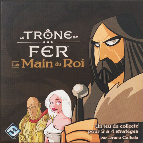 Trône de Fer la main du Roi ressemble à un jeu des 7 familles. Il se compose de 35 cartes des 7 familles de la série et d’une carte Varys. On étale ces cartes pour former un carré de 6×6. Puis, chacun à son tour, va déplacer Varys dans une des 4 directions cardinales jusqu’à n’importe quelle carte famille. Le joueur prend alors la carte famille sur laquelle est arrivé Varys ainsi que toutes les cartes familles de la même famille qu’il a sautées en se déplaçant. Dès qu’un joueur obtient la majorité des cartes d’une famille, il gagne le blason de cette famille. Dès qu’un joueur prend la dernière carte d’une famille, il gagne une carte bonus qui lui donne une petite habilité. A la fin du jeu, le joueur qui possède le plus de blason l’emporte.