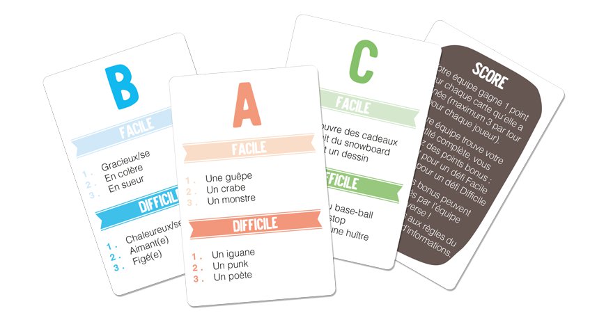 Quand c’est à vous à faire deviner, vous piocher une carte de chacun des 3 paquets A, B et C.