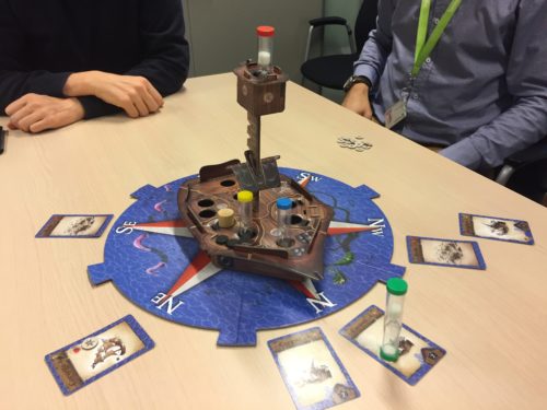 Les actions se déroulent toutes sur le bateau pirate. Ce bateau est disposé sur une rose des vents et autour de cette rose, on va placer des cartes. Ces cartes représentent des frégates ennemies qui nous tirent dessus et qu’il va falloir couler, des rochers qu’il va falloir éviter, des passages étroits qu’il faudra bien manœuvrer ou du brouillard inoffensif. En plaçant son sablier sur un des emplacements du navire, on va pouvoir :