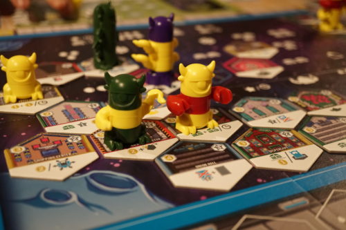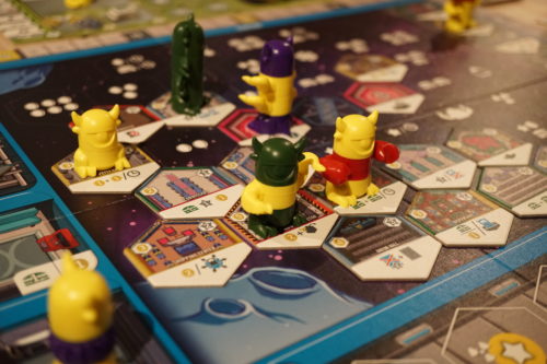 Enfin un développement central. On est habitué quand on retrouve des tuiles hexagonales de devoir les placer pour étendre son territoire, ou son domaine. Ici, les modules (représentés par des tuiles hexagonales) sont placées sur le plateau centrale et leur bonus/bénéfice/action devient disponibles à tous les joueurs. Peut-être pas immédiatement car le joueur qui effectue l’action lui permettant de placer un module a l’occasion d’y placer un ouvrier. Mais les tours suivants, le module accueillera un ouvrier de n’importe quel joueur!