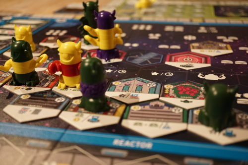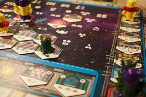 Plein d’autres éléments viennent compléter le tableau. Au final, on a un jeu qui tourne super bien. Pour ma part, pas très attrayant mais c’est subjectif, je l’avoue. Un jeu de placement d’ouvriers avec ici des parties en plastique qui s’emboîtent et se déboitent facilement mais qui tiennent bien en place. De multiples bonus accessibles qui rendent les choix difficiles (on retrouve des bonus sur les hexagones « vides » qui accueilleront les tuiles Module, sur le Réacteur lorsqu’un joueur le rechargera, sur l’échelle de technologie, grace aux différentes « greffes » possibles. Des combos sont également possibles pour ceux qui aiment ça via le placement de tuiles Module ou de leur activation.