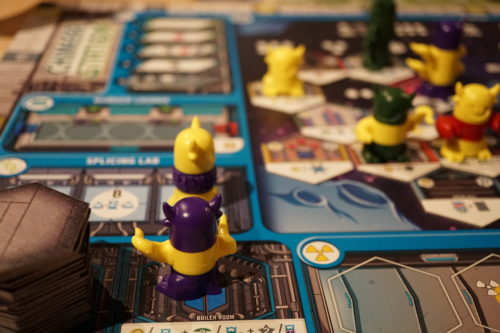 Et SwatSh propose de le sortir vendredi soir. On comprend vite après une trentaine de minutes de règles qu’on a affaire à du placement d’ouvrier. Ceux-ci sont génétiquement modifiable. Et voilà la première surprise. Oui, le joeur peut modifier ses ouvriers et ajouter des tentacules pour qu’il soit plus performant dans la récolte de ressources, des feuilles pour qu’il soit moins en appétit en fin de tour, des pinces pour pouvoir virer les adversaires plus faibles ou encore des cerveaux pour récolter plus de PVs. Avant de se voir greffer ces éléments, il faudra les acquérir. Et c’est au labo que le joueur pourra démonter sa figurine et la recomposer différemment selon l’utilité du moment. Du moment dis-je car plus tard dans la partie, rien ne l’empêche de modifier l’ouvrier pour qu’il remplisse d’autres fonctions plus efficacement.1652 Chimera Station 7