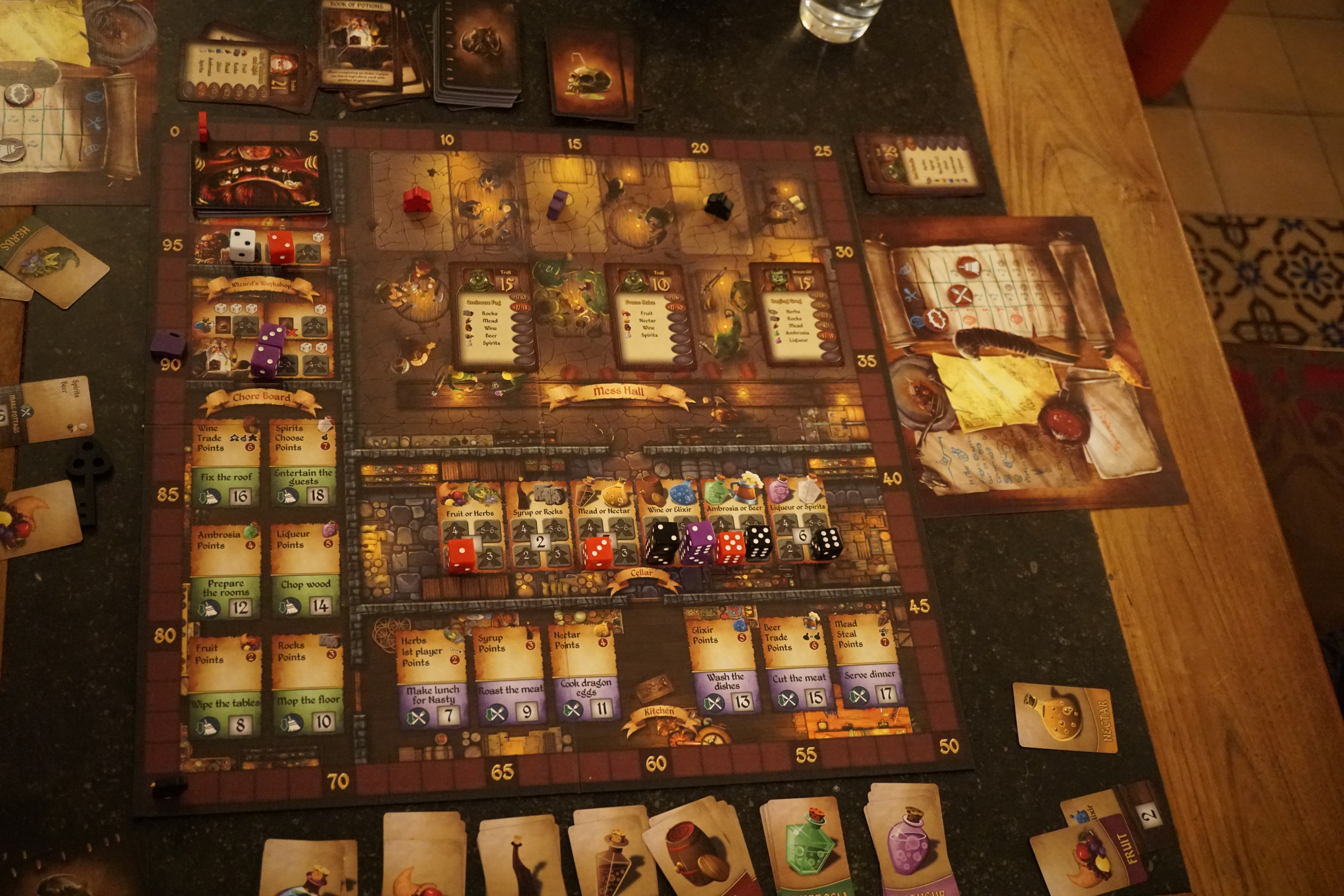 Qu’ajouter encore? Que chaque joueuse reçoit au départ une carte personnage ayant un pouvoir particulier (s’épargner un ingrédient pour une commande, remplacer un ingrédient par un autre, ne pas tirer une carte Nasty quand on doit en tirer une…). Que les emplacements sont limités en fonction du nombre de joueuses (e.g. pour les emplacements sur lesquels on récolte un ingrédient simple il y en aura le nombre de joueuses -1), ce qui induit une certaine compétition (et donc interaction). Que sur son plateau personnel il y a également deux pistes positives, une piste de cuisine et une de tâches ménagères. On évolue sur ces pistes en réalisant des tâches à la cuisine ou des tâches ménagères. Ces pistes permettent de gagner des points en plus et, quand on est suffisamment avancé, de modifie la valeur d’un dé. Que le thème est top, une taverne glauque, avec du bois et de la pierre, bien sombre, tenue par un nain désagréable et peuplée d’humains mais aussi de trolls, de trobits, de hobbits et d’elfes, et que les graphismes, tant du plateau que des cartes, rendent parfaitement cette ambiance. Que le jeu en lui-même tourne super bien. Que la dernière joueuse au début de chaque tour reçoit un dé blanc bonus, ce qui augmente l’intensité de la compétition, sans que ce ne soit une prime à la médiocrité (on n’a jamais intérêt à traîner à remplir sa commande). Que la chance est très peu présente, puisqu’il y a plusieurs endroits où on peut placer des dés d’une quelconque valeur (mais on ne le « comprend » vraiment qu’après quelques parties). Et qu’on peut utiliser ses petits dés pour aller dire du mal des autres… Que l’humour est bien présent dans le jeu (les graphismes, et surtout via les textes des cartes Nasty, qu’il faut absolument lire). Qu’il y a une extension intégrée avec laquelle on peut ajouter le chambre secrète, une pièce où on peut régler ses affaires louchent tranquillement, tenue par Mme Nasty herself, qui est évidemment la seule à tenir tête à Nasty. Et que, last but not least, le jeu donne un goût de reviens-y prononcé (j’ai enchaîné les parties depuis que je l’ai).