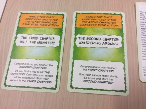 Ce qui est re-très bien avec Flee, c’est le temps à préparer les règles du jeu et à les expliquer : 0’’ ! Oui, je disais la mise en place : on dépose le paquet au centre de la table. Explication des règles : on retourne la première carte et on suit les instructions. On commence le jeu avec une carte qui nous explique les règles et au fur et à mesure que le jeu avance, on va découvrir d’autres cartes « règles » qui vont s’ajouter. C’est extrêmement bien fait, ça ajoute un côté découverte au jeu des plus goûtu.