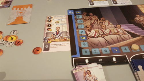 L’autre solution consiste à envoyer la carte à gauche du plateau, et de faire bouger le jeton d’influence contre César, cette fois. Cependant, ce n’est pas gratuit et il faudra s’acquitter d’une somme d’argent pour corrompre la carte citoyen !