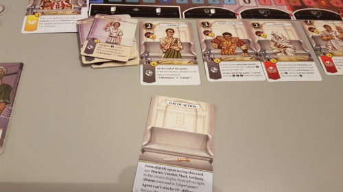 La partie prendra fin lorsque nous aurons révélé la dernière carte de la pioche « Day of Action »…Oui, c’est le moment de savoir si César va s’en sortir ou pas, s’il sera remplacé ou si les républicains vont l’emporter !