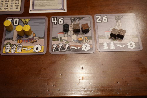 Comme chaque joueur ne peut acheter qu’une seule centrale par tour, le dernier à mettre une centrale aux enchères pourra l’acheter pour sa valeur de base (= son numéro). Je ne suis pas un grand amateur du système d’enchère mais j’aime encore bien ce système car il donne une valeur de référence. Vous pouvez flamber vos électros pour une centrale si vous le désirez mais vous savez que vos adversaires pourront également en acquérir une et peut-être beaucoup moins chère.
