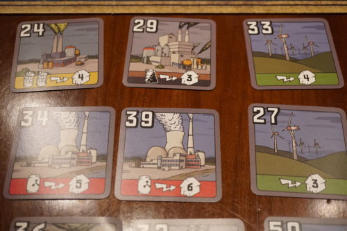 Son système d’enchères est pourtant excellent. A chaque tour, on mettra aux enchères autant de nouvelles centrales qu’il y a de joueurs. Tout le monde pourra en acquérir une, et une seule maximum. Le prix de base d’une centrale est son numéro. Le prix de base de la centrale numéro 9 est donc de 9 Electros (la monnaie du jeu).