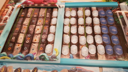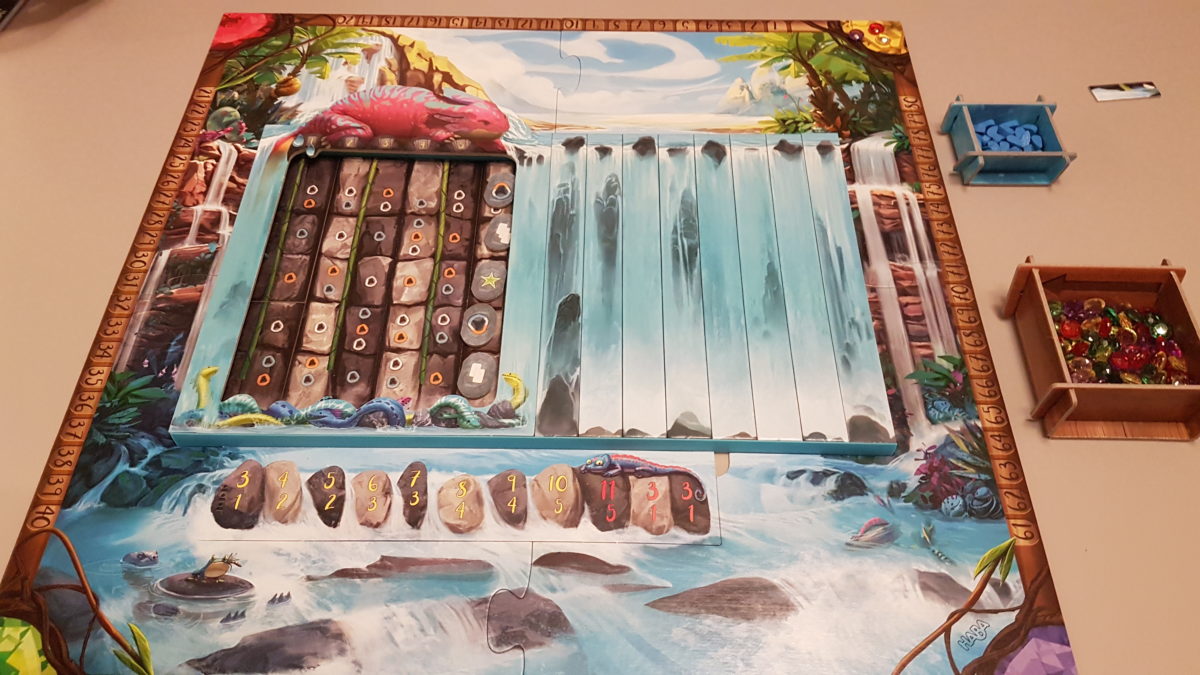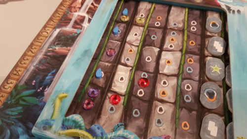 Ensuite, les tuiles du fond, encadrées par deux glissières, sont enfin recouvertes de tuiles de cascades d’eau, et d’une grande tuile formant une fenêtre pour voir le fond de la cascade sur quelques colonnes. En effet, c’est sur cette tuile que le dragon des eaux est censé retenir les chutes d’eau, et ainsi nous permettre de poser des gemmes. On complète enfin le montage en installant une tuile de rochers sous la cascade, et chacun d’eux correspond à des points à gagner pour chaque colonne de fond. Les points dépendent du nombre de joueurs et seront crescendo lorsque la tuile fenêtre se déplacera… Mais continuons à décrire le matériel.