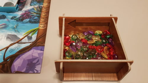 C’est le cas de le dire, Iquazù possède une cascade de matériel pour nous plonger au mieux dans le thème, mais aussi dans sa mécanique. Après avoir posé un plateau central, on disposera des tuiles allongées représentant les dessous de la cascade d’eau. Ces tuiles permettront d’y déposer des gemmes stockées, au départ, dans un boitier à monter. Chacun jouera les gemmes de sa couleur. On disposera ensuite des jetons bonus, face cachées, sur toutes les tuiles sauf les 4 premières qui resteront vides. On révèle alors uniquement les premiers, les autres le seront plus tard.
